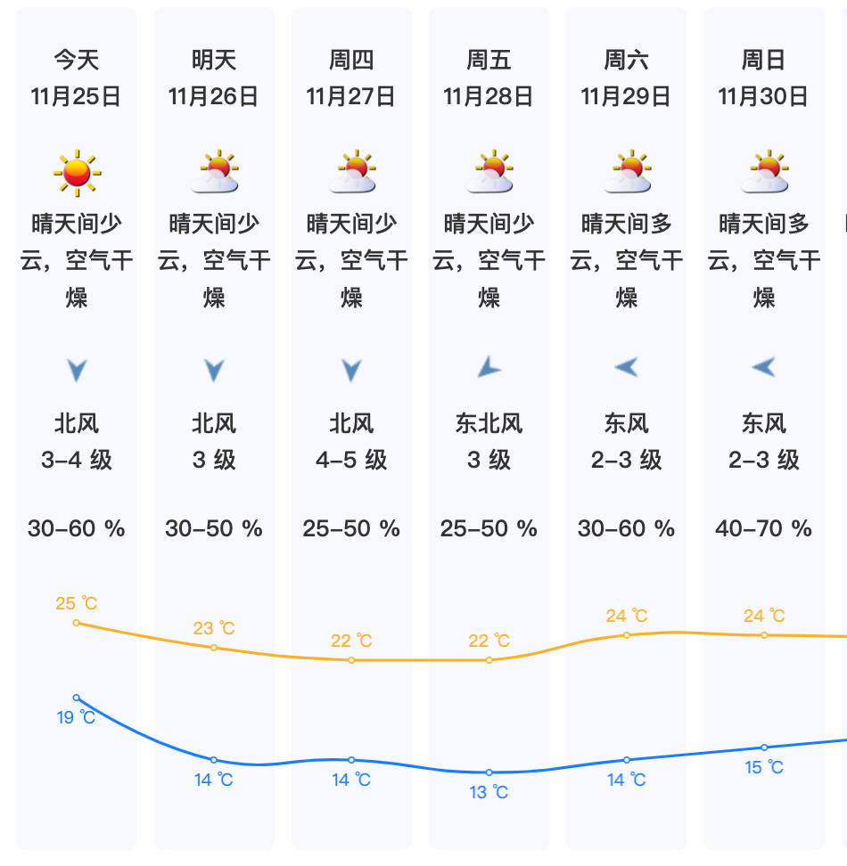 预计25-28日受陆续南下的冷空气影响,晴天干燥为主,最低气温降至13℃左右,其中25日多云到晴天,东北风沿海海区和高地最大阵风7-8级,气温17-24℃。