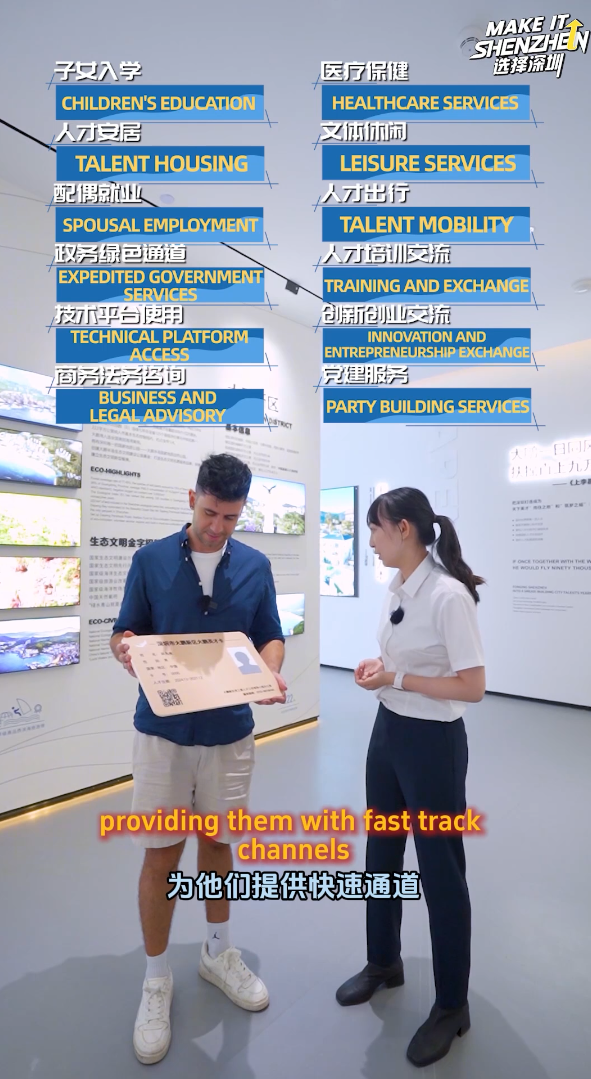曾立云向Rafael介绍了大鹏特色的人才卡政策。 在大鹏工作的全职高层次人才可申领此卡,享受涵盖子女入学、医疗保障、人才安居、文体休闲服务、配偶就业、人才出行、政务绿色通道、人才培训交流活动、技术平台使用、创新创业交流服务、商务法务咨询服务及党建服务12类专属权益。
