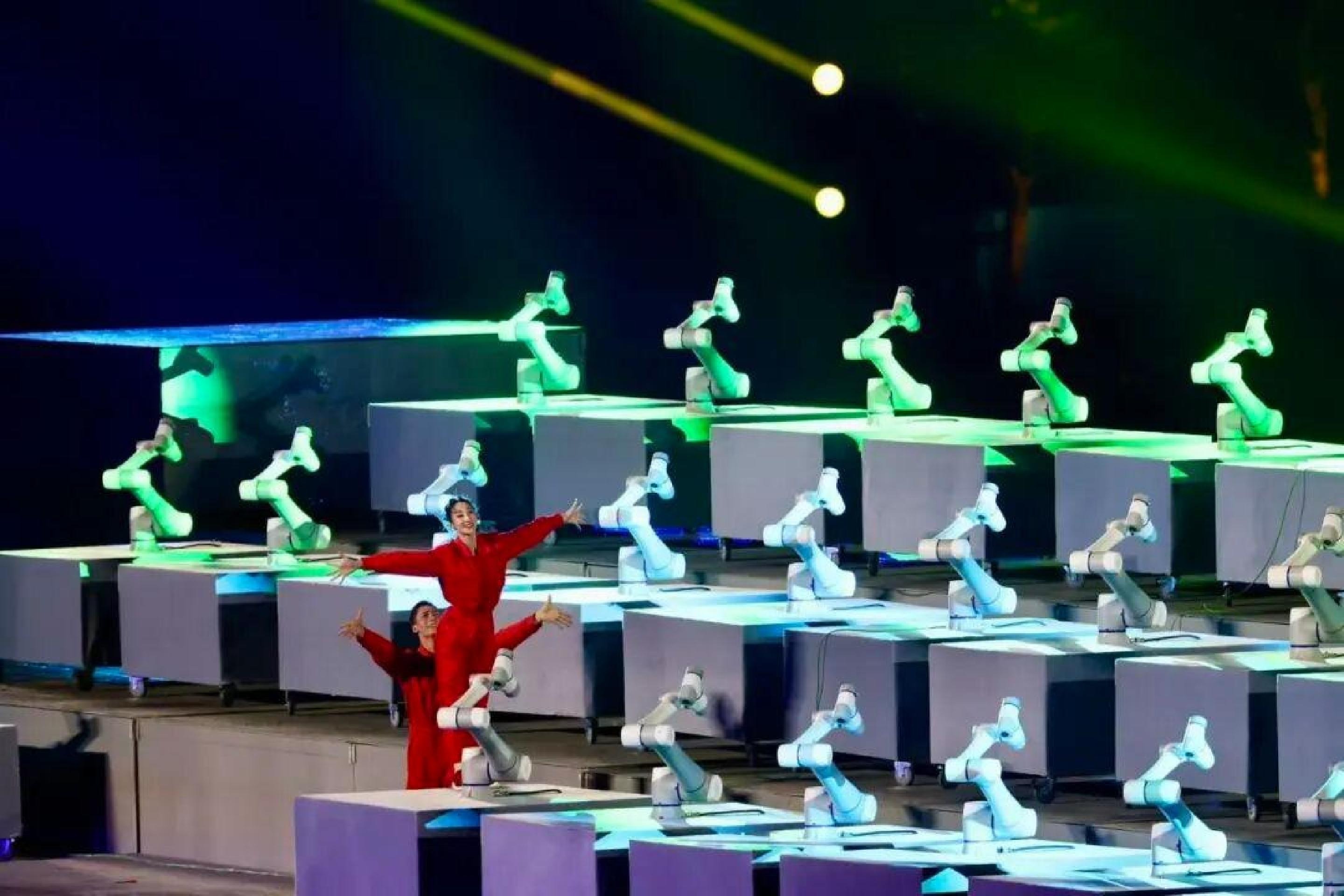 在激情澎湃的《红日》音乐背景下,16台煜禾森科技的移动机器人呈方阵,整齐划一地向舞台中央驶去,到达指定点位后,它们开始变化队形,与舞蹈演员们优美的舞姿配合,在海天之间勾画出一副极具未来感的画卷。