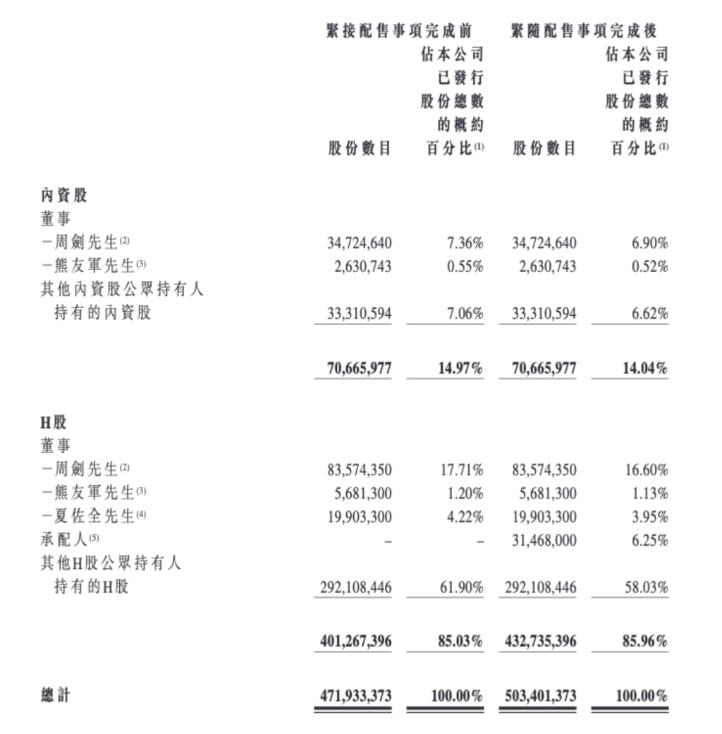 根据公告,优必选拟按每股98.8港元配售(较24日收盘价111.50港元折让11.39%,较前五日平均收盘价121.32港元折让18.56%),配售后已发行股本将由4.72亿股增至5.03亿股,H股占比由85.03%升至85.96%,周剑、熊友军、夏佐全等主要股东持股比例下降,但均未达10%阈值,预期无承配人成为主要股东,控制权不受影响。