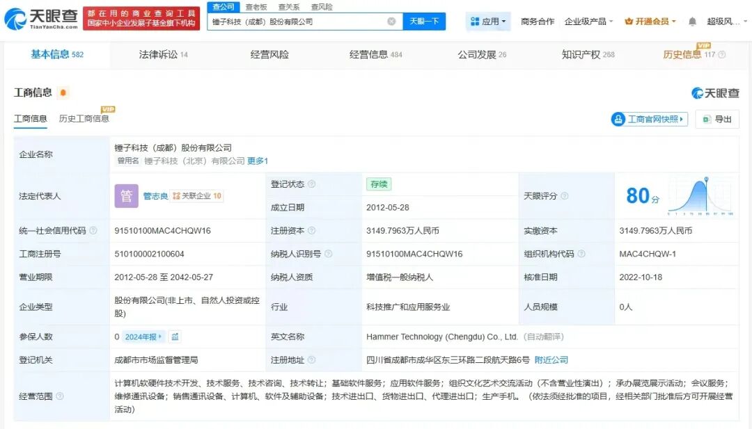 天眼查天眼风险信息显示,近日,锤子科技(成都)股份有限公司新增1条被执行人信息,执行标的714万余元,执行法院为北京市大兴区人民法院。