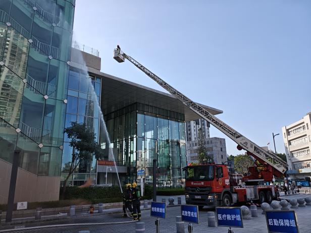 活动在宝安1990音乐外平台启动。现场模拟“演奏厅电气插座故障导致起火并迅速蔓延”的紧急情景,火源蔓延、人员被困、疏散组织、应急处置等环节依次展开。参训人员全程观摩指挥调度、救援力量进场、内部力量配合等流程,直观了解突发火情的处置节奏。演练结束后,消防救援人员结合现场设备,对灭火器的选择、操作步骤和注意事项进行了示范。
