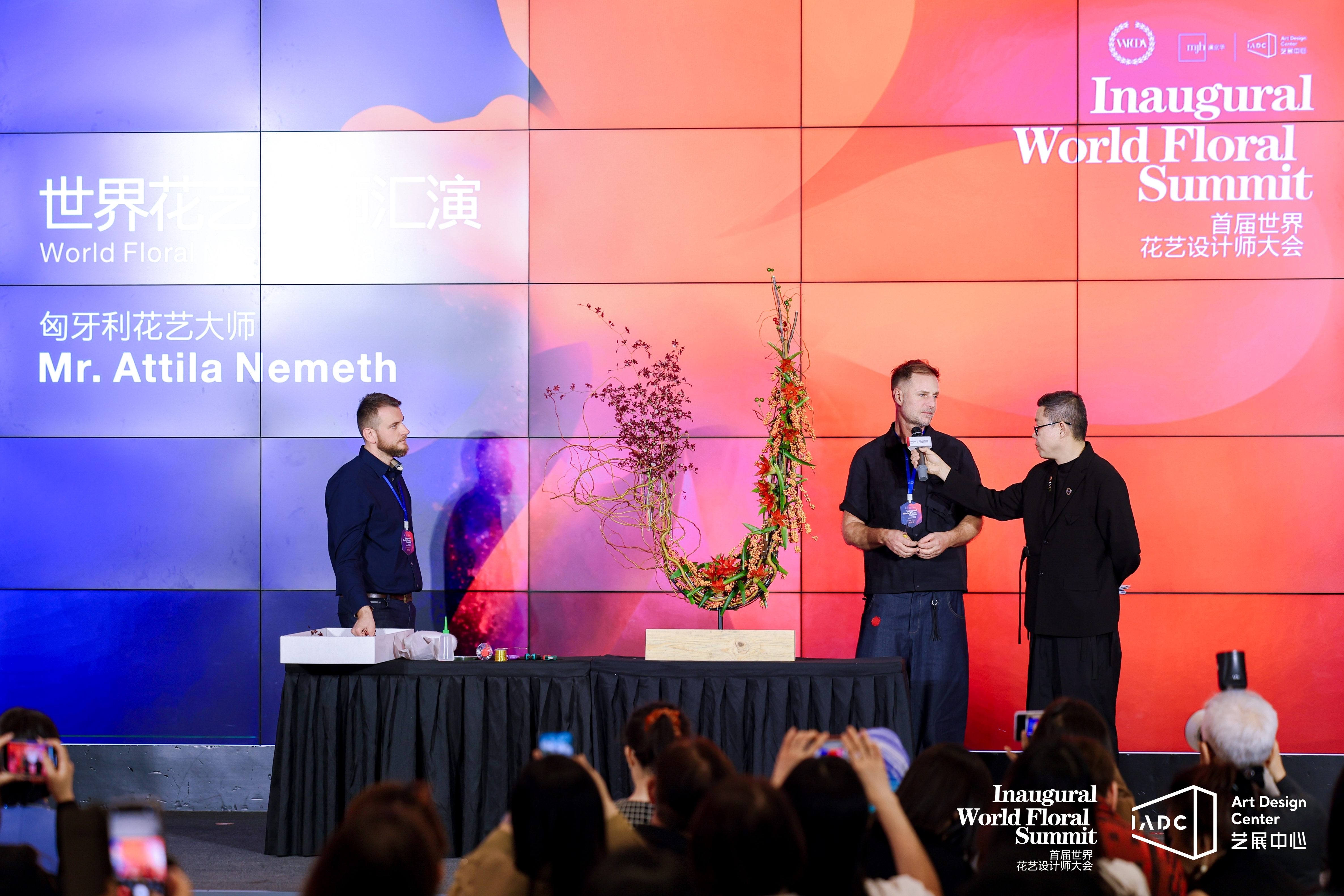 开幕仪式上,花艺大师阿提拉与吴勉联袂献上精彩绝伦的开场表演。阿提拉将匈牙利传统艺术与现代设计语言完美融合,大胆的用色与创新的空间构造,展现了中欧花艺的独特魅力;吴勉则以标志性的架构花艺技法,把独具东方特色的竹子融入其中,引发观众阵阵惊叹。此外,来自马来西亚、新加坡、巴基斯坦、中国香港和澳门等国家和地区的花艺大师们也带来了惊艳四座的花艺演绎,实现了东西方美学的精彩对话。