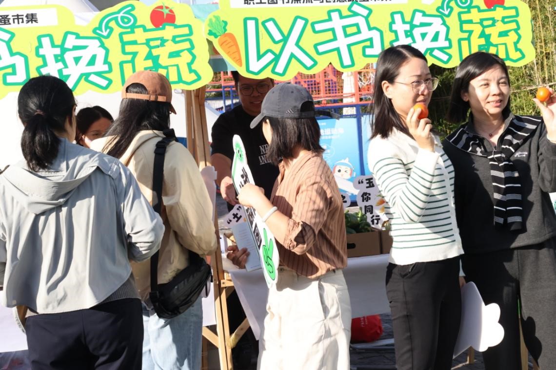 而 “以书换蔬” 图书漂流与创意跳蚤市集环节则掀起参与热潮。职工们纷纷携带家中闲置书籍前来兑换新鲜蔬菜或萌趣伴读公仔,让闲置图书 “流动起来”,实现知识共享与循环利用。“用闲置的专业书换了满满一袋青菜,既环保又实用,还能带动自己多读书”,一位参与活动的职工笑着说道。该环节不仅以趣味形式引导职工养成健康饮食习惯、增添阅读乐趣,更传递了绿色低碳的生活理念,让阅读与生活场景无缝衔接。