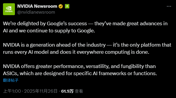 英伟达在社交平台X上发文称:“我们对谷歌的成功感到高兴——他们在人工智能方面取得了巨大进展,而我们也将继续向谷歌供货。”