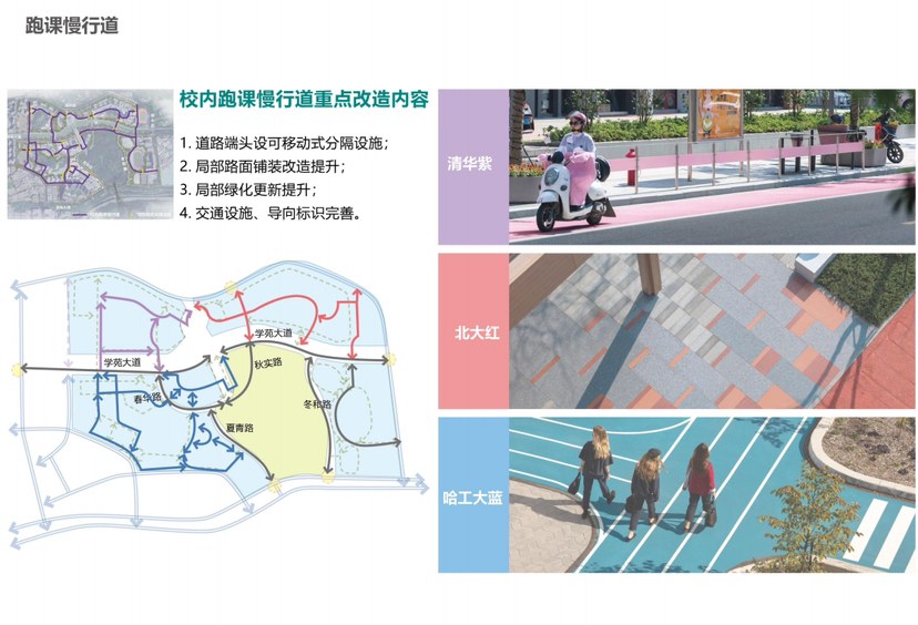 在设计图上,这条跑课环线被清晰标出。规划考虑通过统一导视系统和铺装语言,用连续色带、节点标识等方式形成一眼可识别的慢行主通道,并可通过统一色带和节点标识强化路径识别度,让学生顺着颜色即可辨认跑课方向。