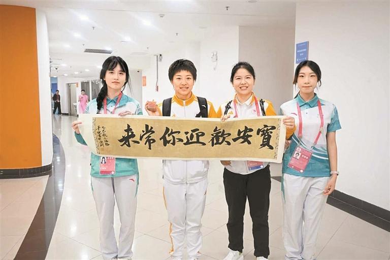 拳击赛场,电信学院200名“小海豚”志愿者分布在11个处室、39个服务岗位,以平均18.5岁的青春力量诠释了“奉献、友爱、互助、进步”的志愿精神,他们的故事被央视两次报道。其中,作为医疗点服务助理,黄莘倪的服务点位于运动员检录区,协助医生与护士完成医疗保障任务。在女子48-50公斤级决赛落幕后,她将自己精心准备的两份礼物——亲手刻制的拳击小海豚印章和书法作品“宝安欢迎你常来”送到了冠军吴愉手中。这份用心准备的礼物让冠军连连称赞:“太好了,这个真的好,特别有纪念价值!”