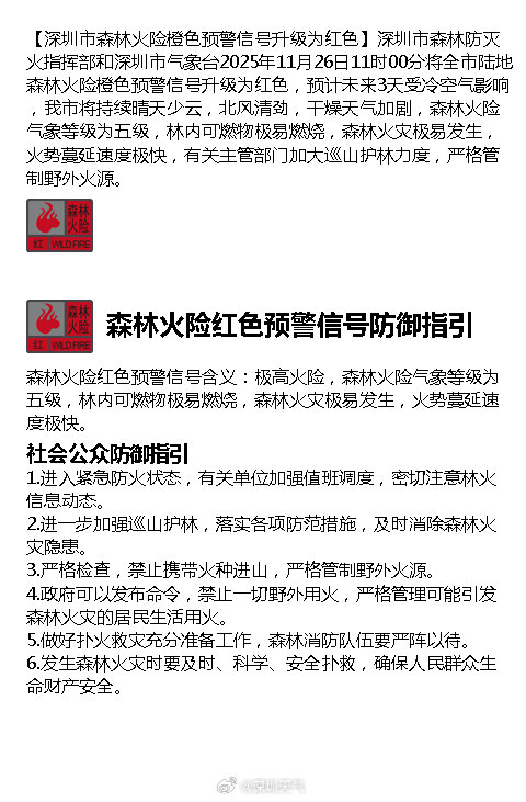 深圳市森林防灭火指挥部和深圳市气象台2025年11月26日11时00分将全市陆地森林火险橙色预警信号升级为红色,预计未来3天受冷空气影响,深圳将持续晴天少云,北风清劲,干燥天气加剧,森林火险气象等级为五级,林内可燃物极易燃烧,森林火灾极易发生,火势蔓延速度极快,有关主管部门加大巡山护林力度,严格管制野外火源。