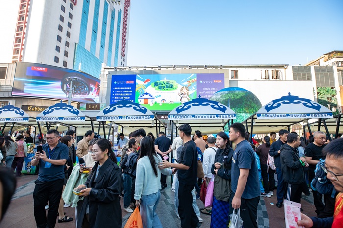 尽管不是周末,但随着夜幕降临、灯光闪烁,在内蒙古音乐的悠悠旋律中,活动再次迎来人流高峰。据不完全统计,在11月25日开幕当天,“草原集市”吸引了北京路商圈超20万人流量,每个展位都是人头攒动。