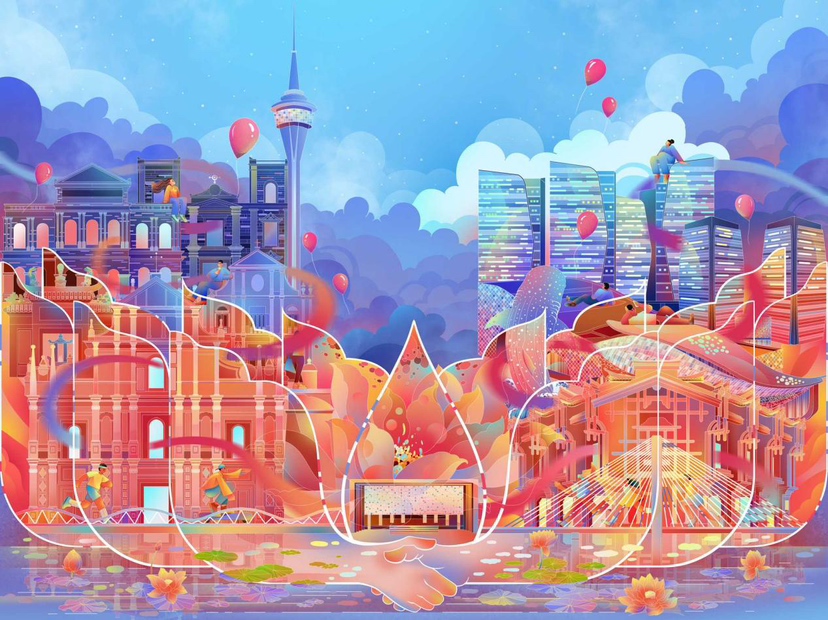 其中,由司徒罗杰创作的插画作品《魅力琴澳》以其整体性和艺术表现力脱颖而出,获得评委团的最高评价。该作品以澳门区旗上的莲花为核心创意灵感,展现了横琴与澳门两地的紧密联系和独特魅力。