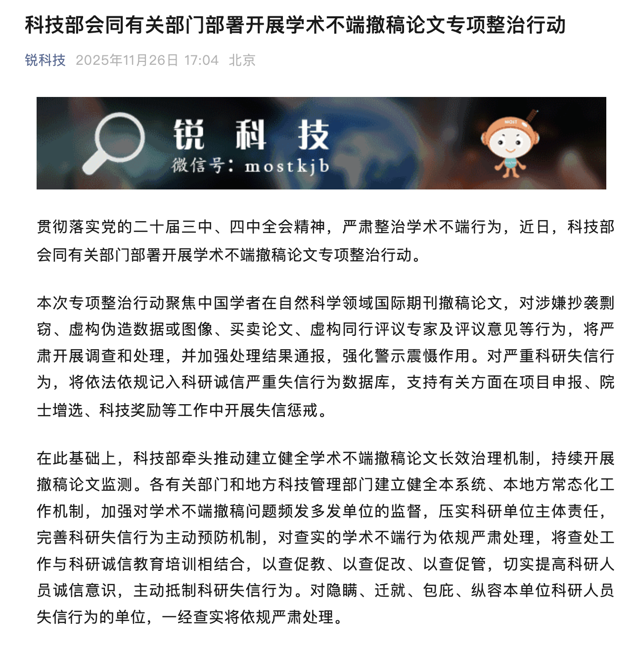 据科技部微信公号“锐科技”:为贯彻落实党的二十届三中、四中全会精神,严肃整治学术不端行为,近日,科技部会同有关部门部署开展学术不端撤稿论文专项整治行动。