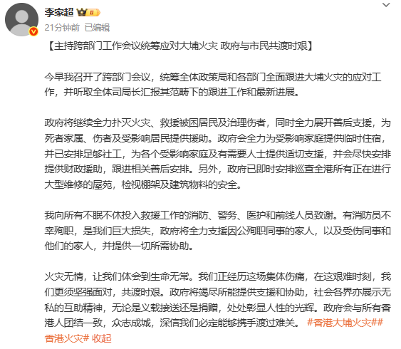 李家超表示,极度重视本次火灾,目前首要工作是扑灭火情及救助伤者。