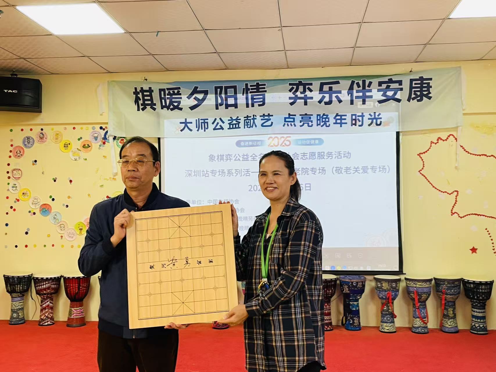 活动在温馨有序的氛围中拉开帷幕。下午三时,长者们陆续入场,精神矍铄、笑意盈盈。捐赠仪式上,中国象棋协会向深圳市龙华区晚晴苑养护院捐赠了编号为016号的2025年度中国象棋协会棋具,表达对老年群体文化生活的深切关注与持续支持。