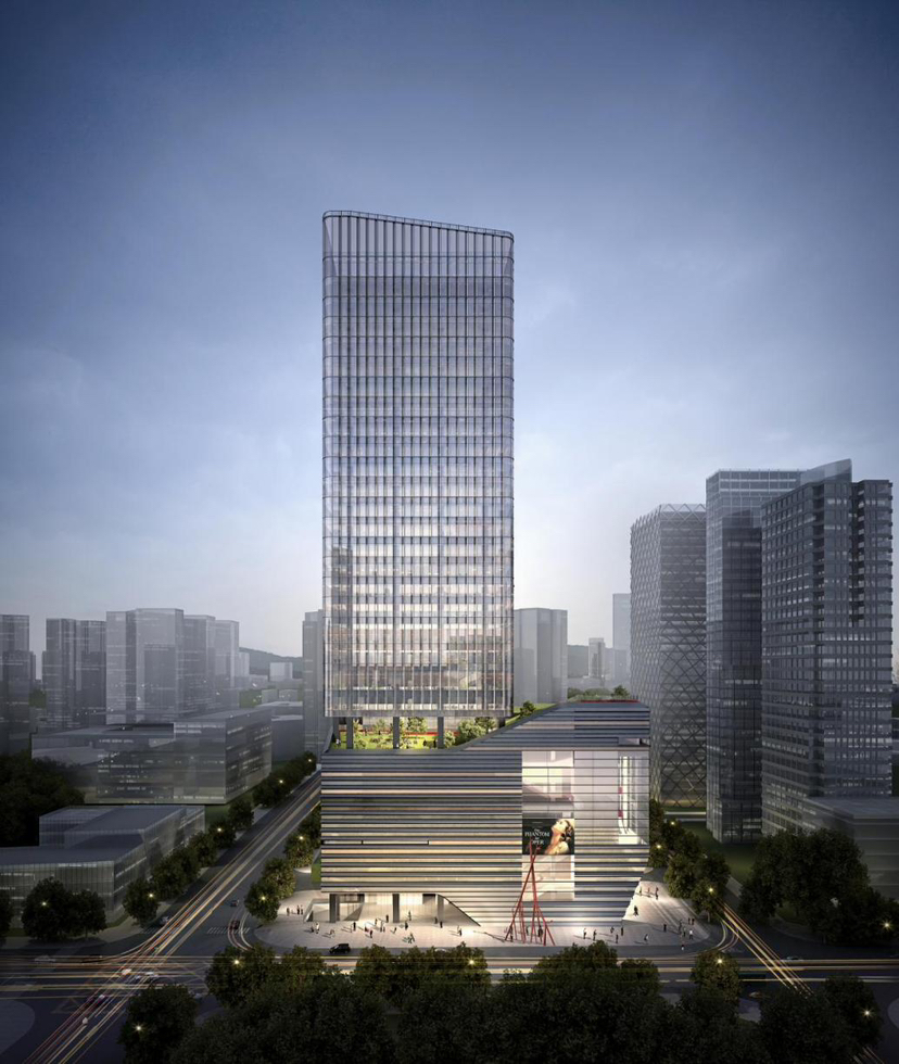 该综合体塔楼采用框架+偏心核心筒结构,有效提升建筑使用率,并将城市最优景观面展示于市民。裙楼采用框架结构,通过大跨度体系,将大剧场、音乐厅及公共空间垂直叠加,实现竖向空间的充分利用,不仅减轻了对周边居住区的空间压迫,更通过立体布局打造出多层公共平台。