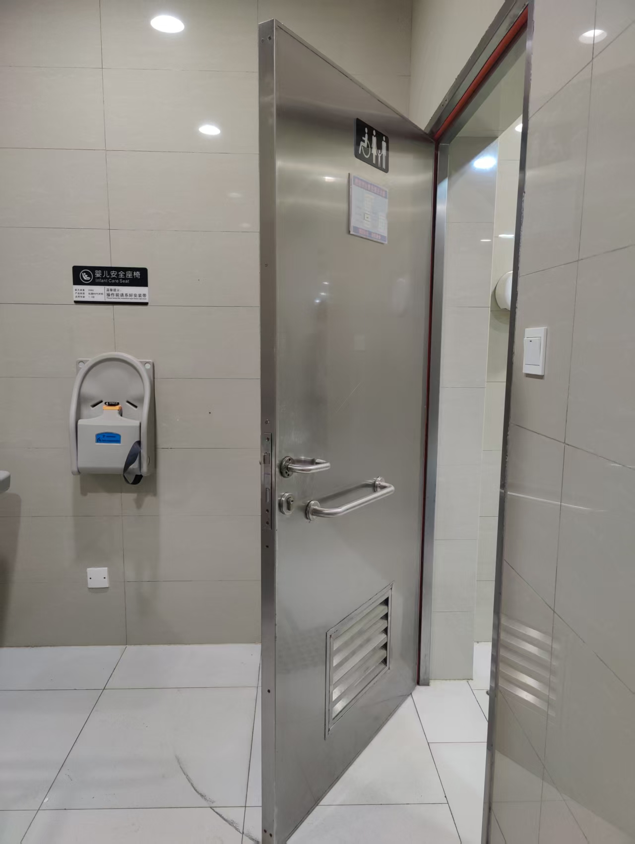 除高铁站之外,记者留意到,部分地铁站的无障碍卫生间也使用了类似的金属材质大门,但不同站点的设计不太一样,包括扶手设计、报警按钮的位置、开门和上锁的方式等等。