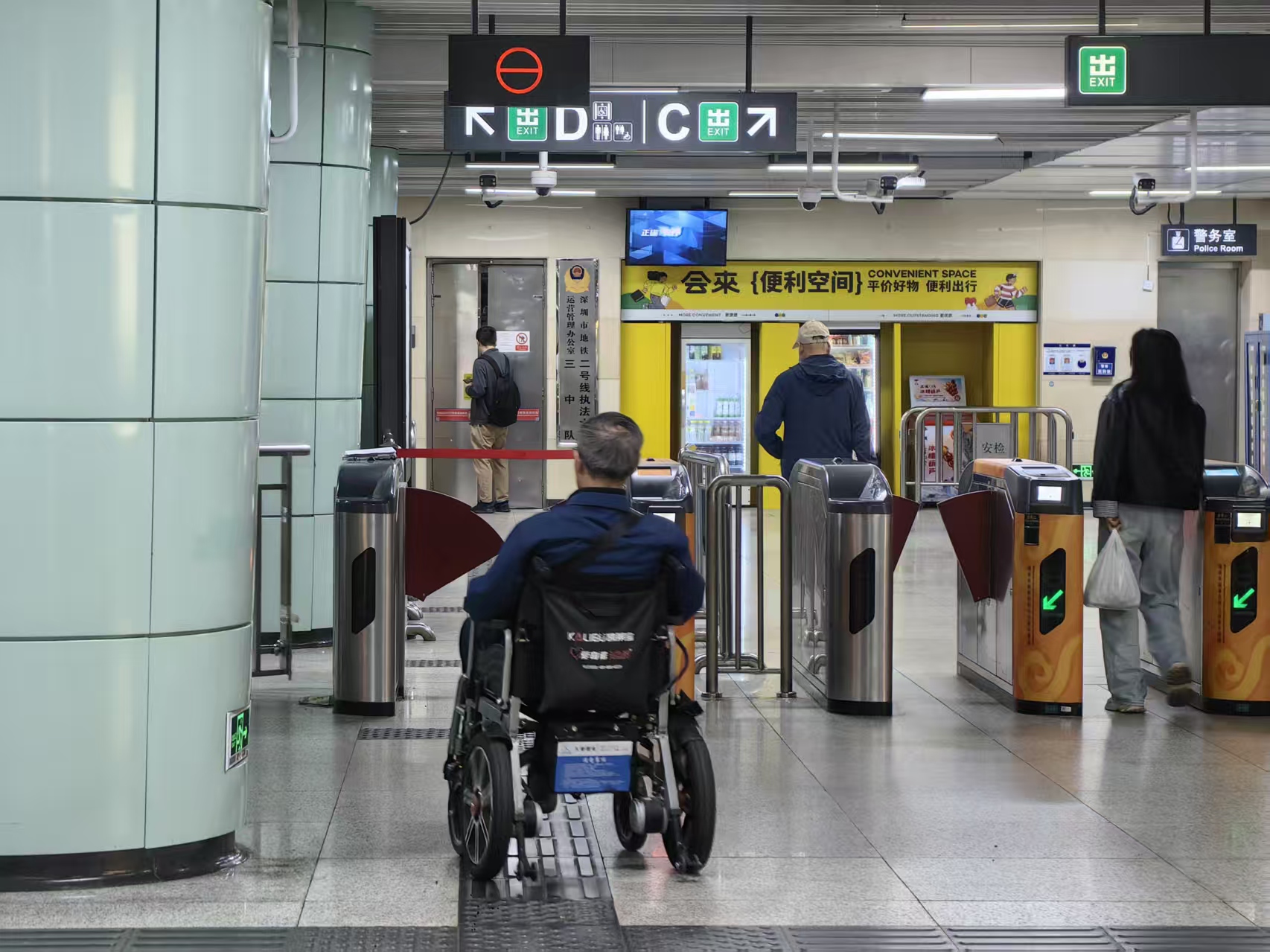 地铁站内,使用轮椅出行的市民。