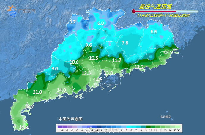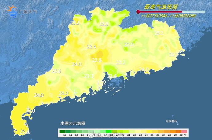 今天,冷空气补充影响广东,28-29日控制广东省的冷高压减弱。