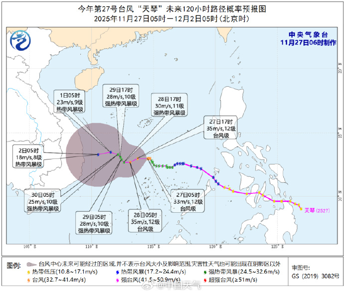 中央气象台今早6时继续发布台风蓝色预警:今年第27号台风“天琴”已于今天(27日)凌晨加强为台风级,早晨5点钟其中心位于海南省三沙市(西沙永兴岛)南偏东约485公里的南海东南部海面上。