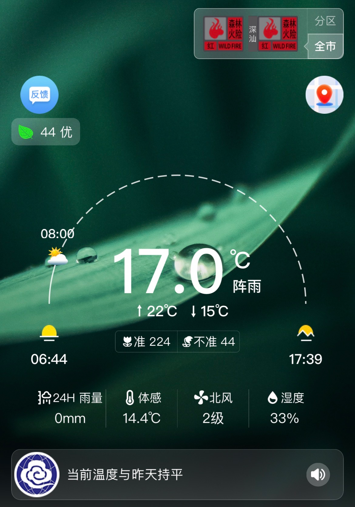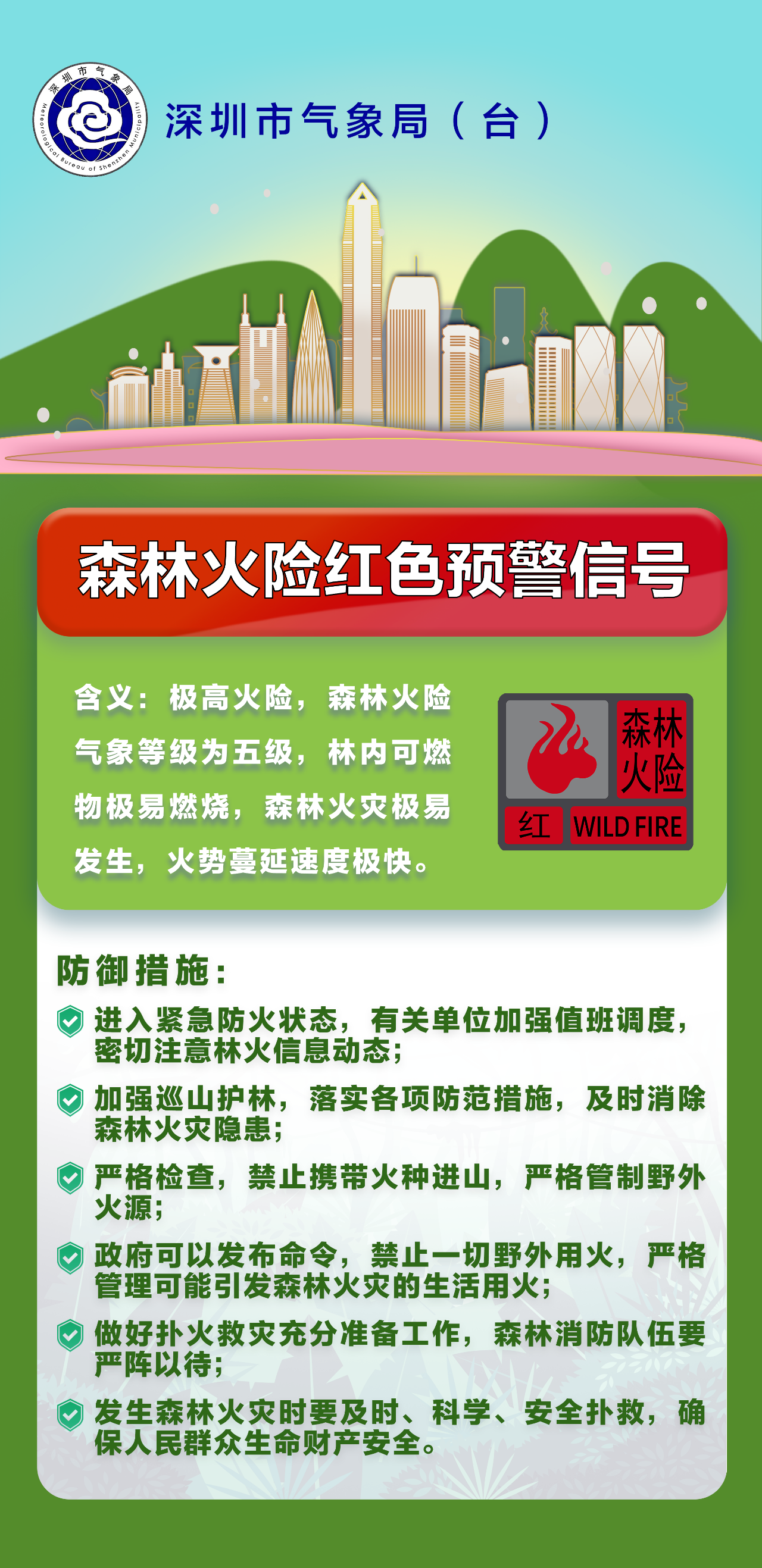 全市森林火险红色预警信号生效中,请注意用火安全,及时补水。