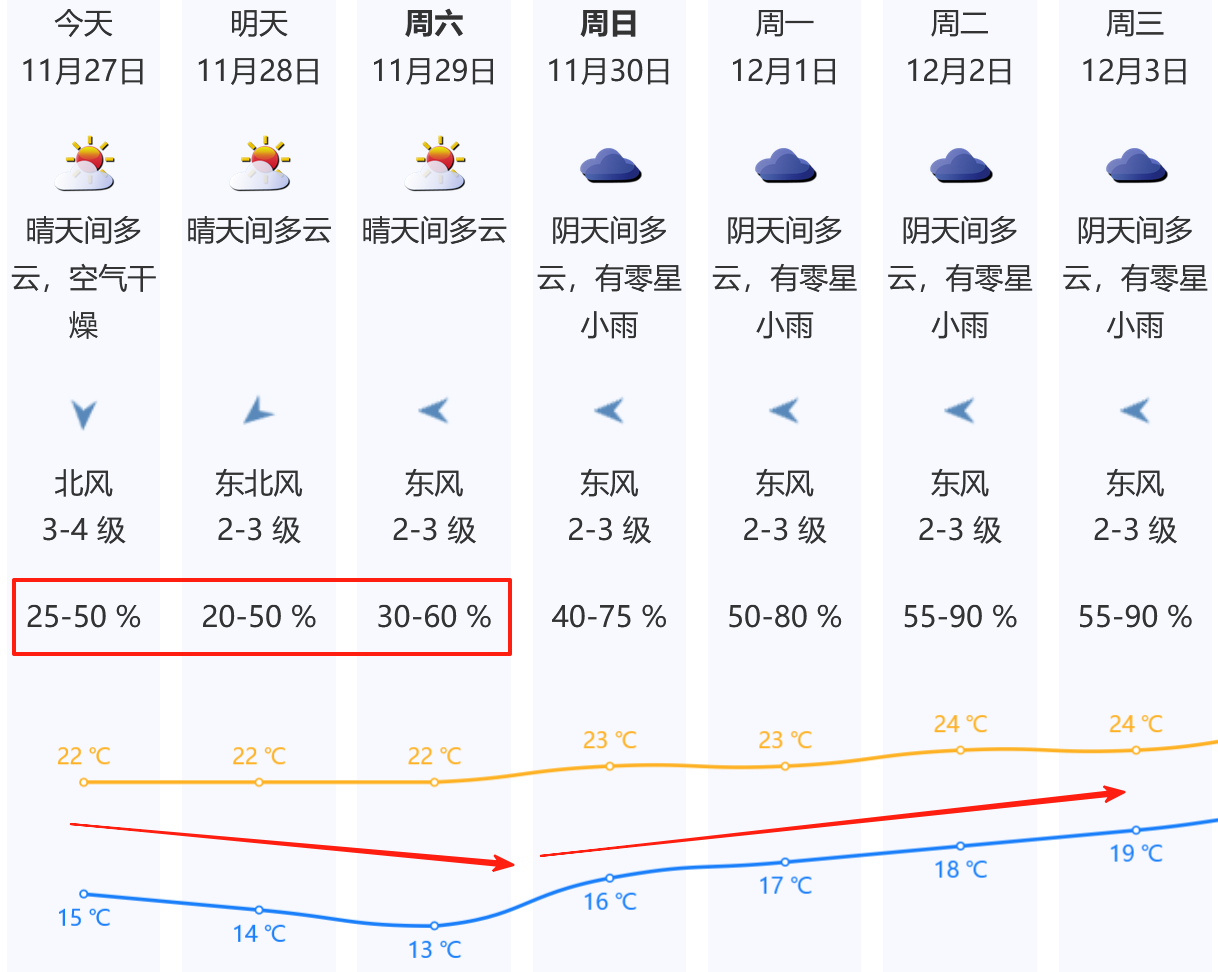 27-29日,受弱冷空气影响,深圳持续晴天,干燥加剧,气温略降,昼夜温差大。