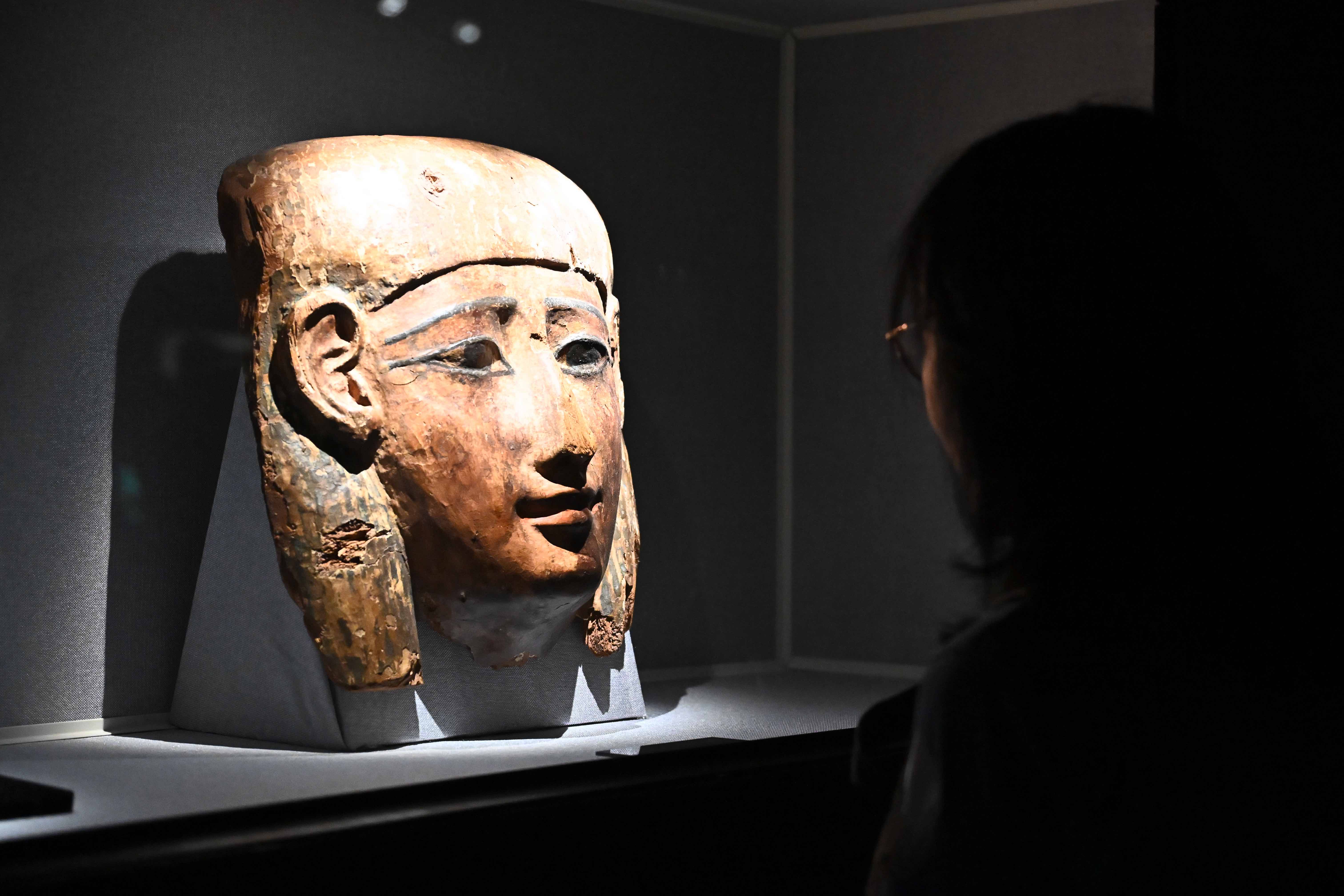展览汇集 200 余件自然遗宝与跨文明古代艺术珍品,从象征宇宙星尘的自然形态与宫苑书阁中的赏石意象,到恐龙骨架、恐龙蛋(含胚胎)化石,再到古埃及木制木乃伊面具、绶带鸟纹鎏金银盘、金巴亚文化鼻环陶俑、古埃及“七圣油的供奉”石碑,以及宋代木胎彩绘水月观音、白瓷贴塑双龙柄壶等代表性器物,在 1500 余平方米的空间中铺开一条从地质年代到人类文明的时间长轴,让观众在一步一景间完成一场“万年文明速通”。