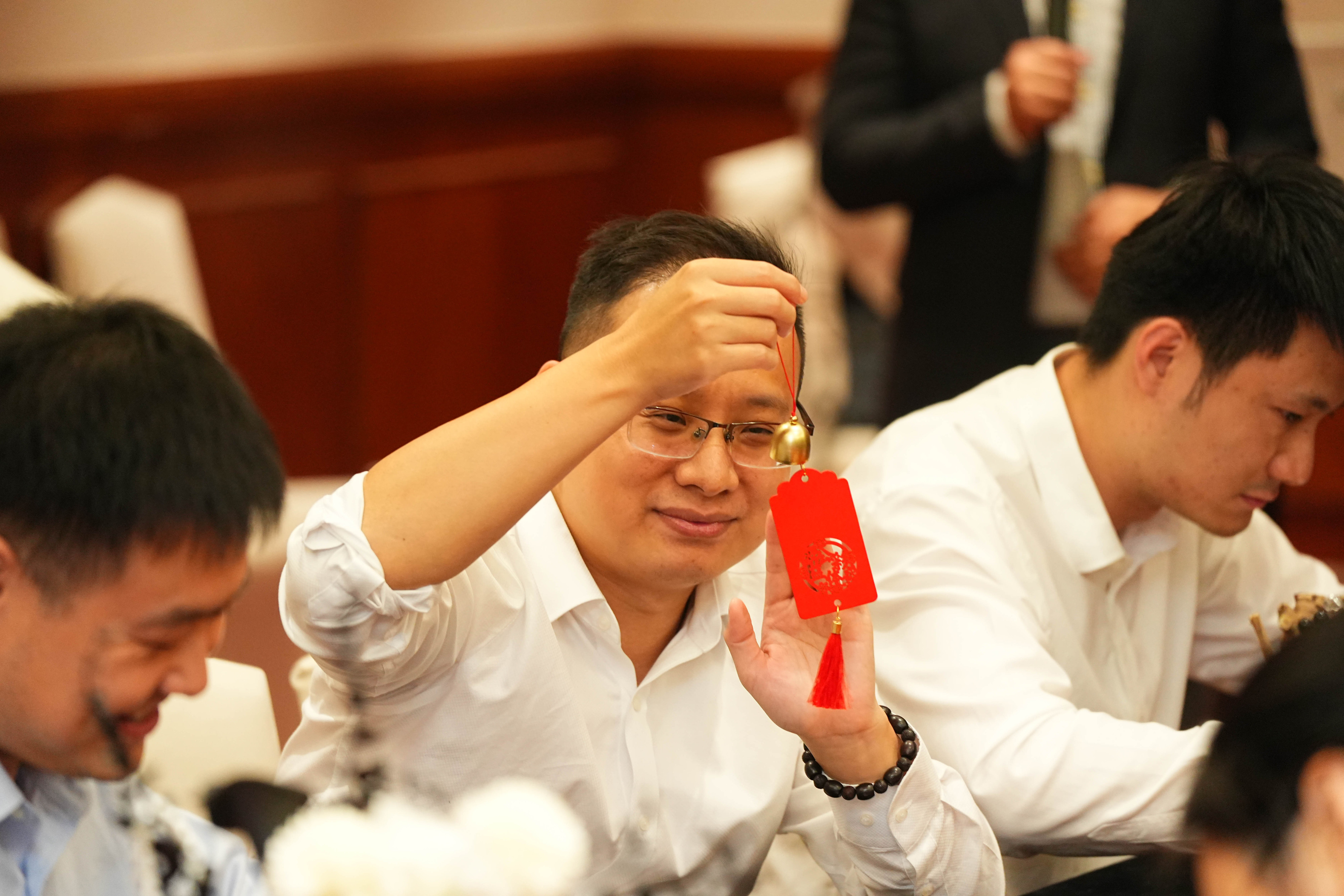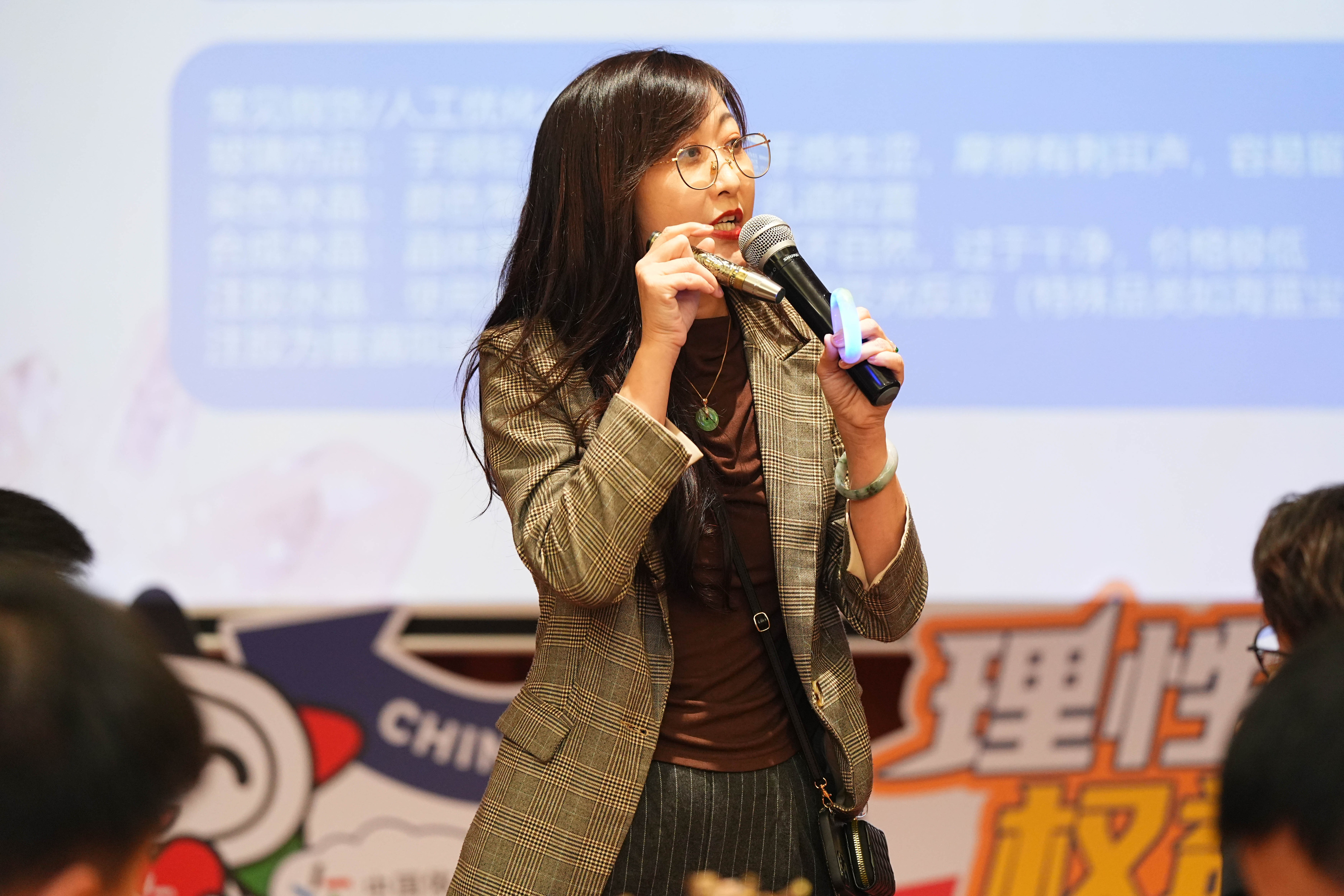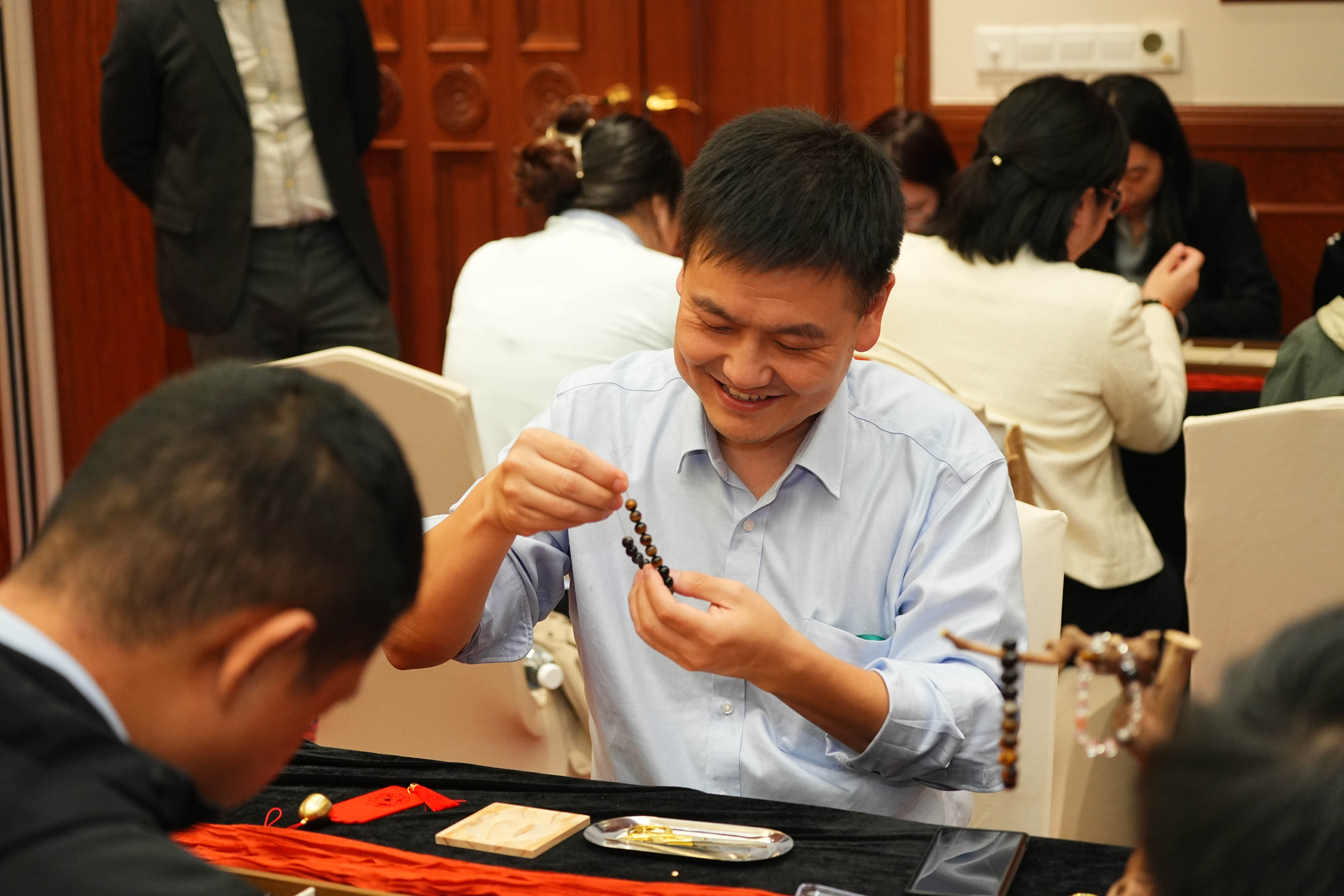 非遗国潮手作环节的现场布置尤为精心,处处彰显巧思:桌面以沉稳的深色桌布为底,上方覆盖着温润典雅的橙色桌旗,色彩对比间尽显格调,桌上错落摆放着多款水晶项链装饰摆件与质感细腻的雕纹盒,为现场增添了几分雅致韵味,让金融白领们在忙碌之余快速卸下疲惫。主讲老师寥寥数语诠释了水晶寓意:蓝水晶映照“清醒判断”,黄水晶代表“价值认知”,紫水晶寓意“自我约束”。在专业老师指导下,参会者亲手挑选水晶、串联成型,把理性与责任“戴”在手上。“这串手串既是活动的纪念,更是日常的提醒,往后不管是自己购彩还是与他人分享,都会记得这份清醒与克制。”一位参会者手持成品感慨道。