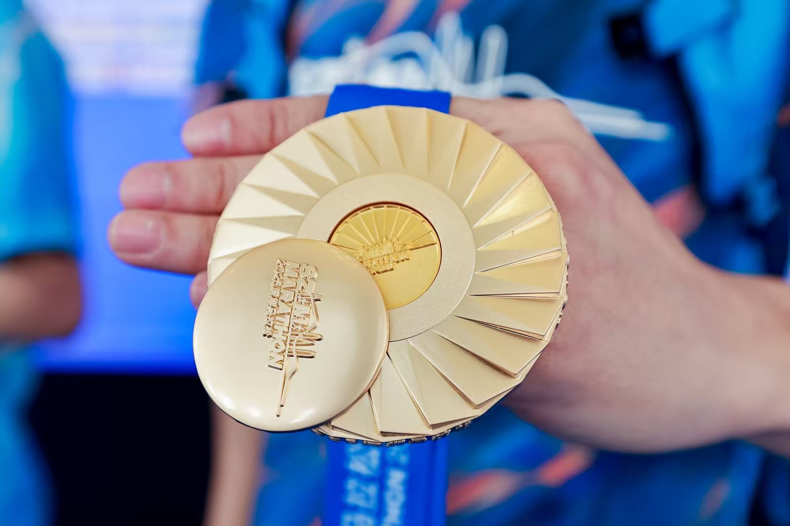 参赛服将深圳湾的壮丽日出“穿”在了身上。设计以海天的宁静之“蓝”为底,晕染朝阳喷薄之“金”,衣身流动的波纹线条再现了晨光穿透海雾的动人瞬间。这不仅是一件战袍,更是与城市脉搏同频的奔跑宣言。