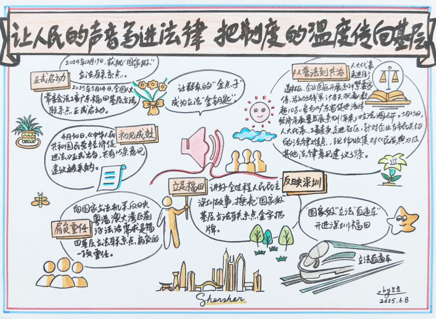 基层立法联系点,一头连着立法机关,一头连着基层群众。2024年12月以来,福田基层立法联系点对《中华人民共和国民营经济促进法》《中华人民共和国企业破产法》《广东省促进海洋经济高质量发展条例》等法律法规草案征集立法建议,汇聚基层民意和产业一线声音,相关工作成果上榜2024年度深圳“十大法治事件”,荣获2025第三届走好新时代网上群众路线创新实践活动“十大金案”,充分展现了基层民主实践的活力与效能。