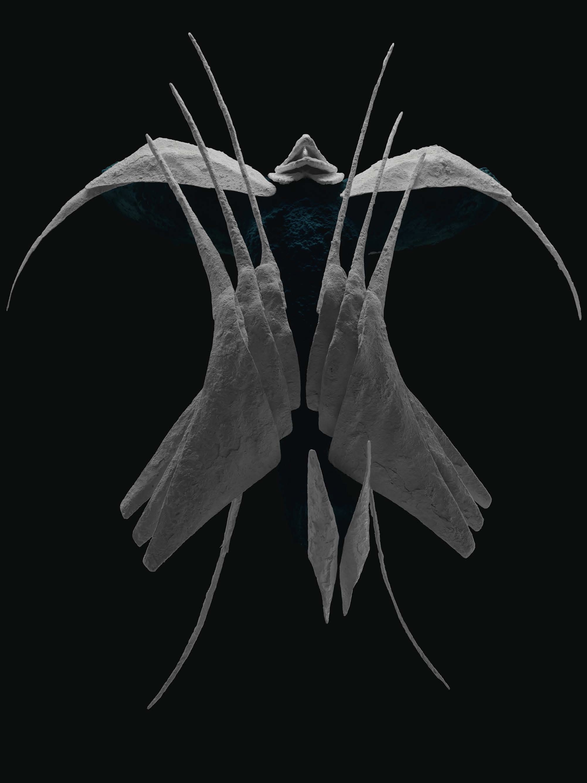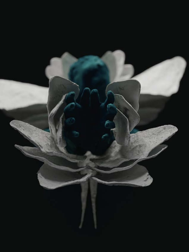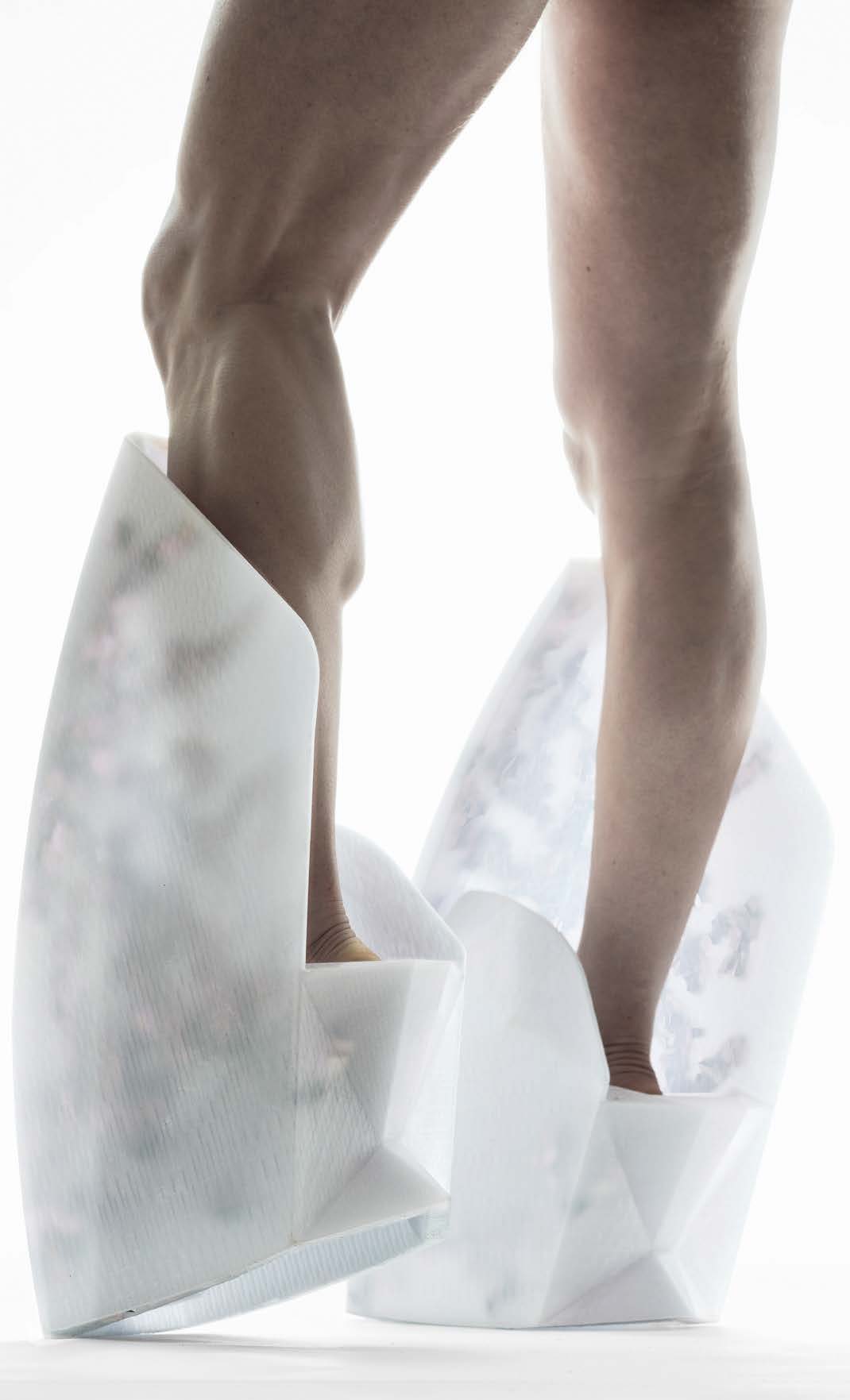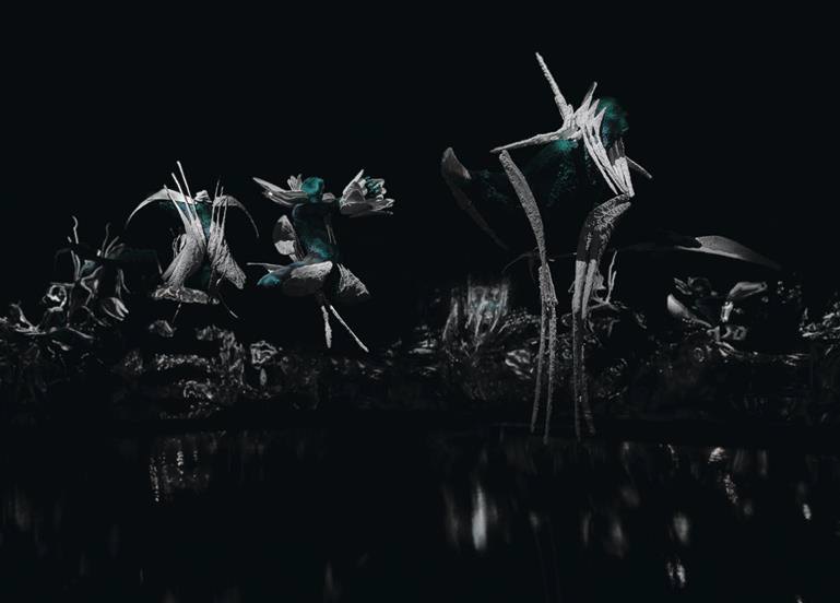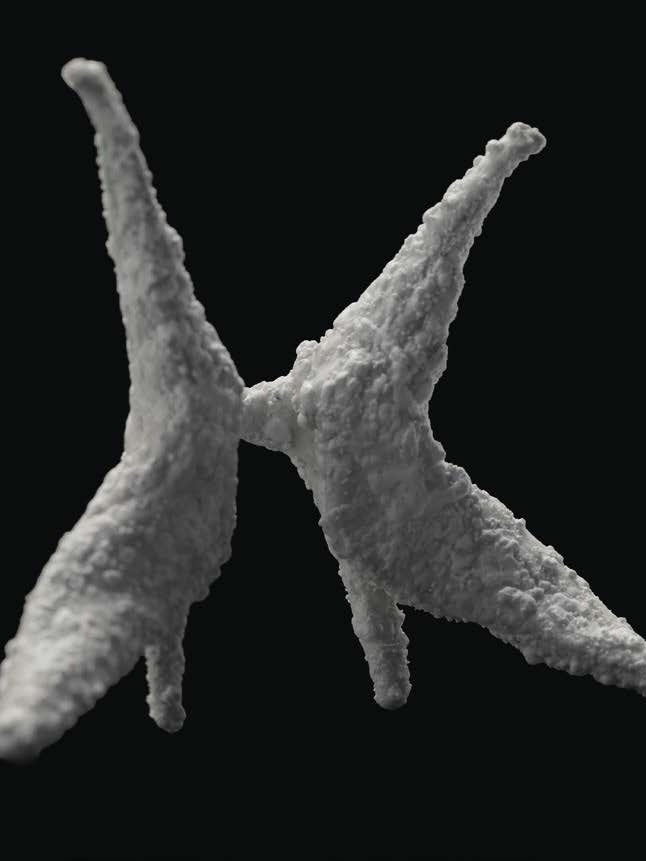 ● 《深渊纪》 (Abyssicide) 装置,运用仿生珊瑚增生技术,从海水中“培育”出骨骼状雕塑,预言海平面上升时活体珊瑚礁的可穿戴形态
