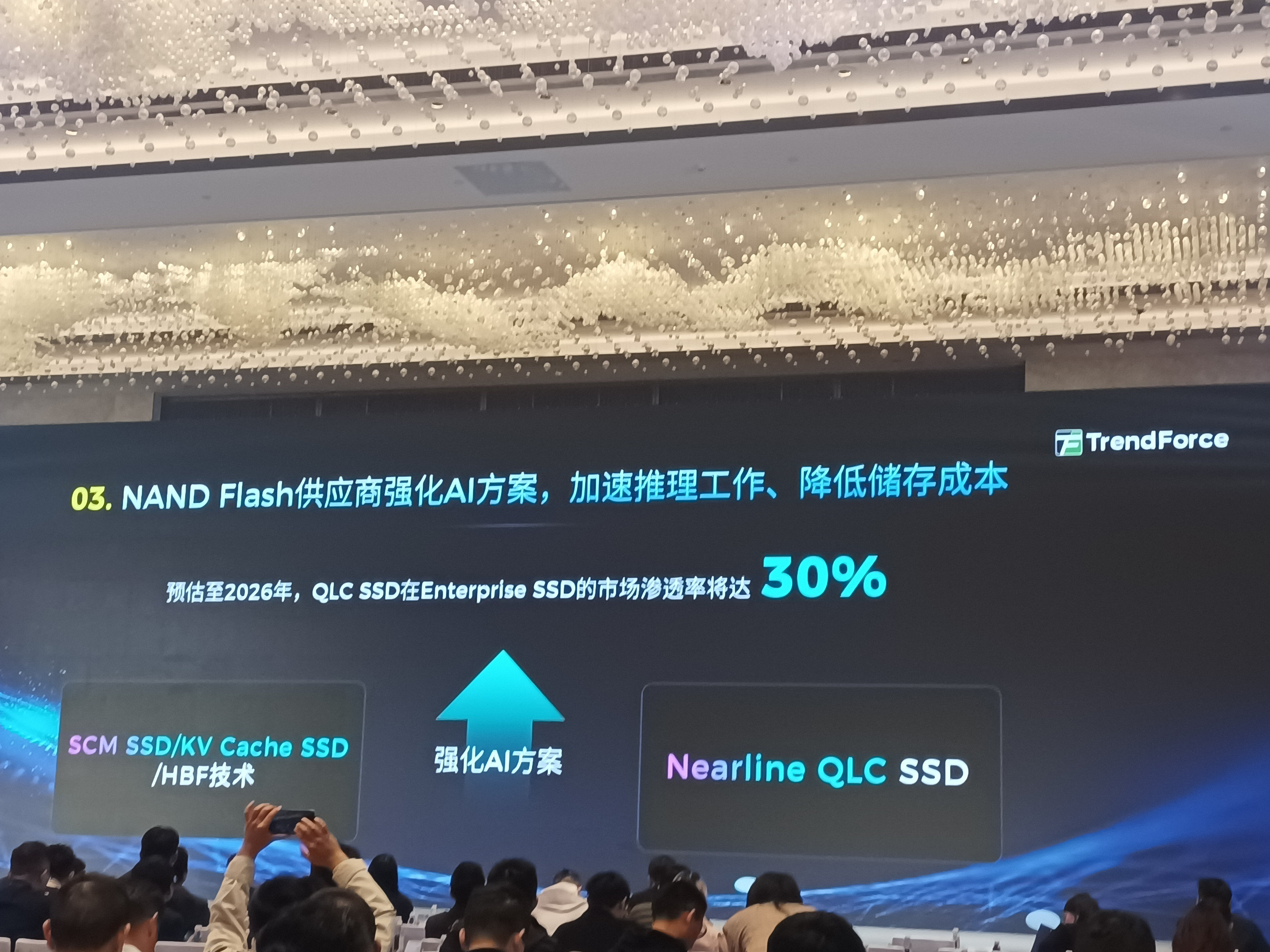 另一项是Nearline QLC SSD,QLC技术正以前所未有的速度被应用于AI的温/冷数据储存层,例如模型检查点与数据集归档。QLC的每晶粒储存容量较TLC将高出33%,大幅降低储存巨量AI数据集的单位成本。预估至2026年,QLC SSD于Enterprise SSD的市场渗透率将达30%。