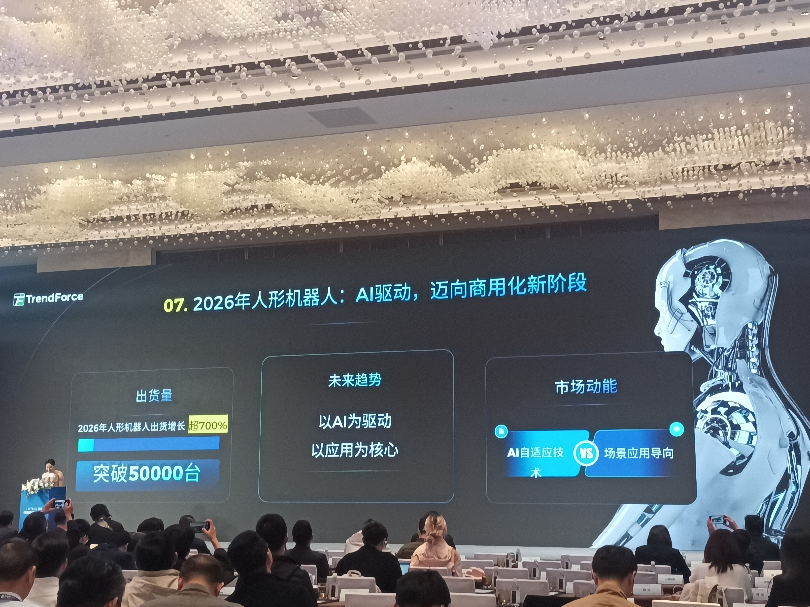 报告也预测,2026年将是人形机器人迈向商用化的关键一年,全球出货量预估年增逾七倍、突破5万台,市场动能聚焦于两大主轴:AI自适应(AI Adaptivity)技术与场景应用导向。AI自适应技术结合高效AI芯片、感测融合与大型语言模型(LLM)的进化,使机器人能在非结构化环境中实时学习与动态决策,展现“谋定而后动”的行为能力。