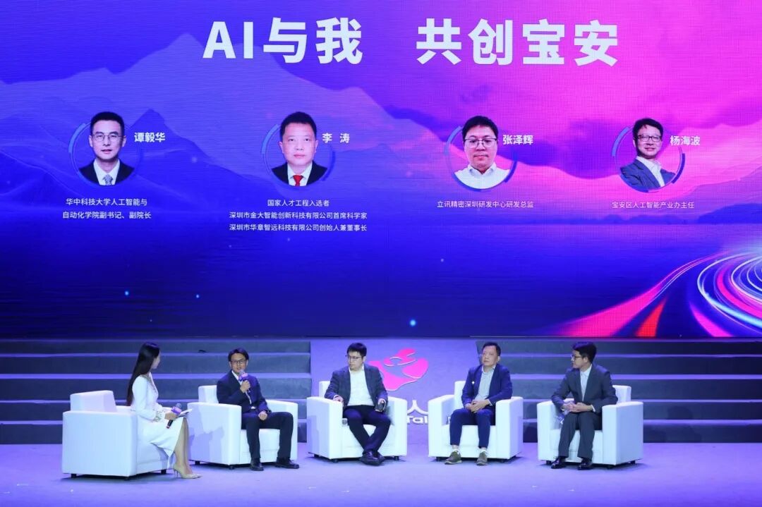 来自政、校、企三方的嘉宾——华中科技大学人工智能与自动化学院副书记、副院长谭毅华,深圳市金大智能创新科技有限公司首席科学家、深圳市华章智远科技有限公司创始人兼董事长李涛,立讯精密深圳研发中心总监张泽辉,以及宝安区人工智能产业办主任杨海波,围绕“AI与我,共创宝安”分享了真知灼见。