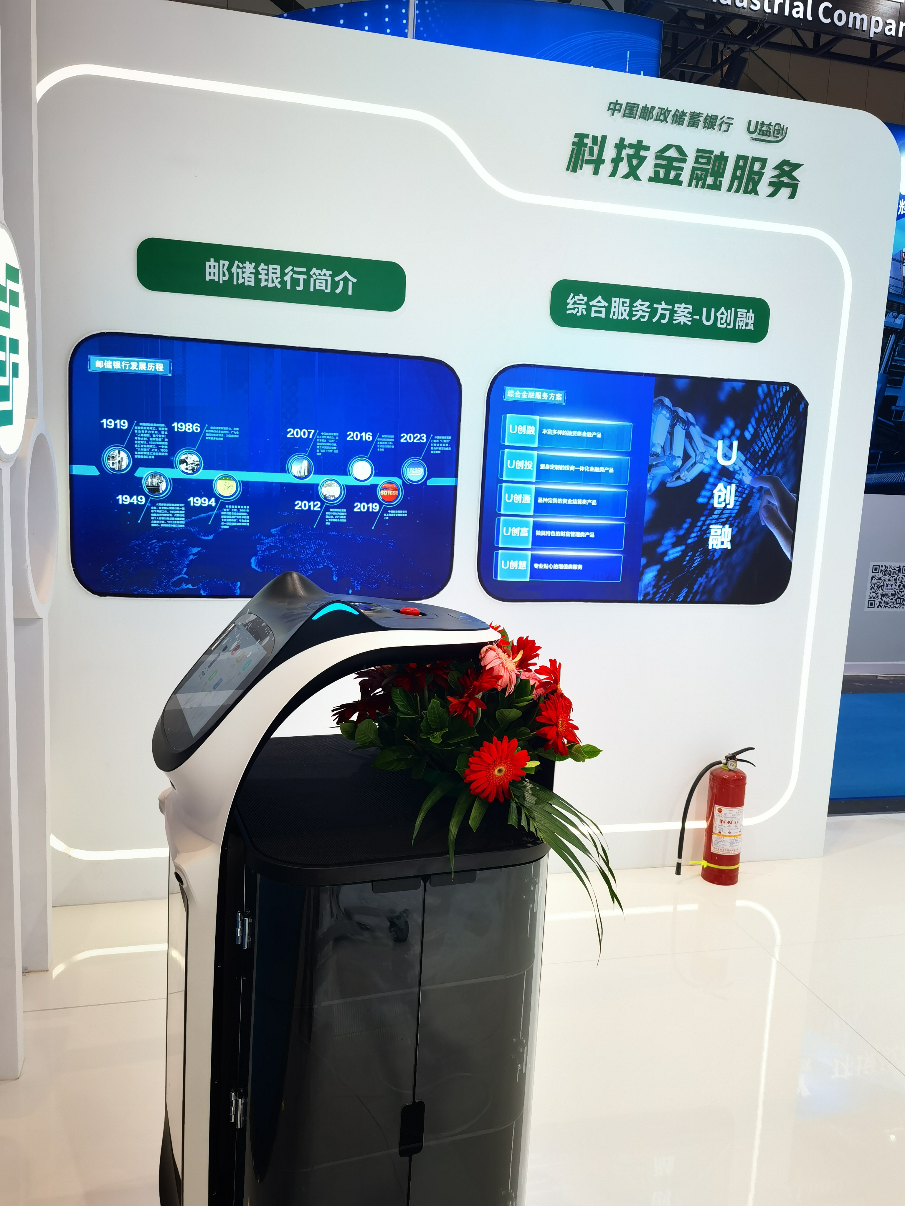 在今年“高交会”上,邮储银行深圳分行是为数不多在现场布展的银行机构,普渡科技的机器人在模拟金融赋能场景下精准完成AI语音交互、资料讲解等系列操作。