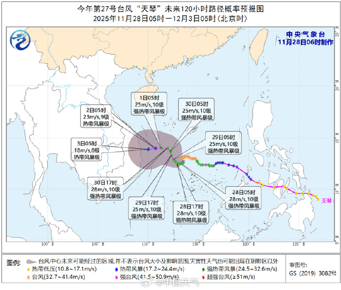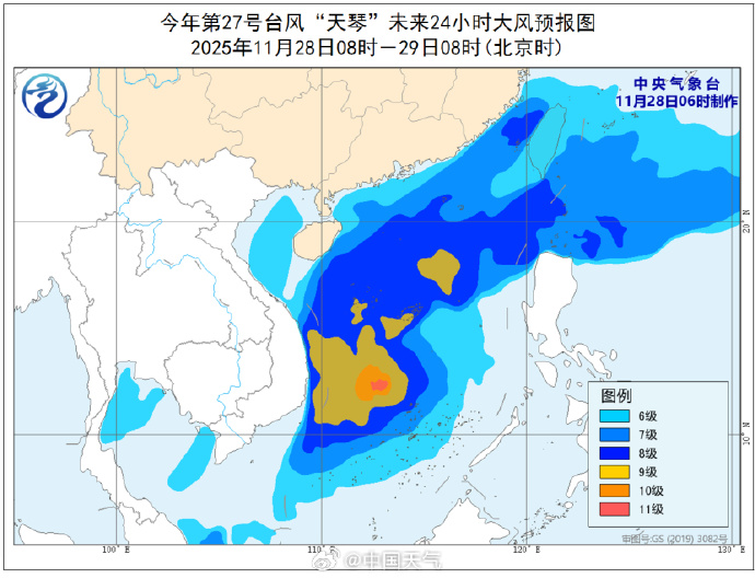 预计台湾海峡、台湾以东洋面、巴士海峡、南海大部及东沙群岛、西沙群岛、中沙群岛、南沙群岛、黄岩岛附近海域、北部湾、台湾沿海、福建沿海、广东沿海、海南岛东部沿海将有6-8级大风,其中,南海中部和西南部的部分海域风力可达9级,“天琴”中心经过的附近海域风力可达10级,阵风11-12级。黄岩岛、中沙群岛将有大到暴雨,局地有大暴雨。