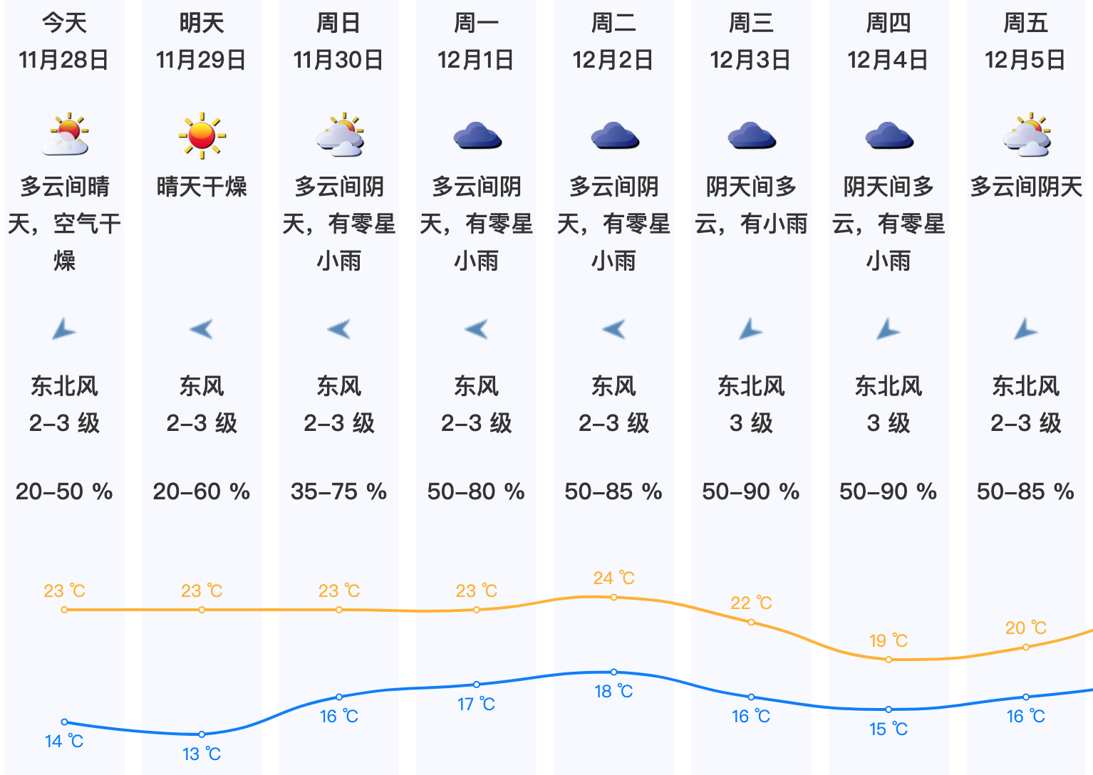30日至12月2日云量增多、湿度增大,间中有零星小雨,干燥天气有所缓解。