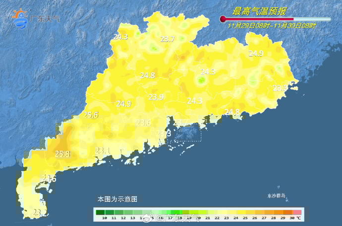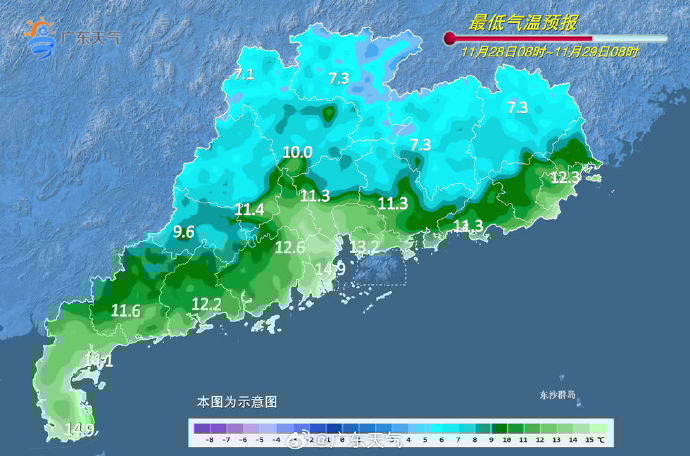 29日,粤西到珠江口西侧市县晴转多云,其余市县晴间多云。最低气温:粤北和珠江三角洲北部市县3~9℃,局部有霜冻,南部沿海市县12~14℃,其余市县9~12℃。
