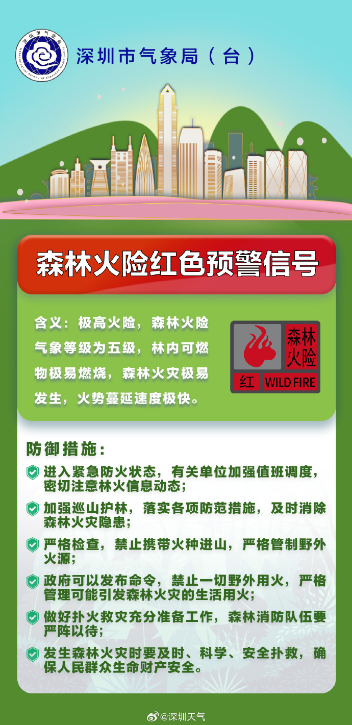 全市森林火险红色预警信号生效,这意味着:极高火险,森林火险气象等级为五级,林内可燃物极度干燥,森林火灾发生概率极高。