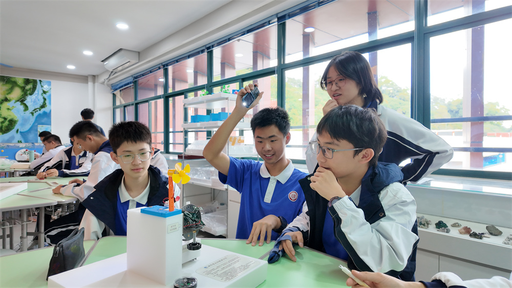 星辰科学馆外,一群学生正用天文望远镜进行观测天体练习。行科瑜老师向我们展示学生拍摄的天体照片并讲道:“每周我们都会安排多次观测天体的机会,一方面是可以培养学生兴趣,另一方面是更好地理解课本知识。”教室另一旁,地理组学生正将课本知识转为实践,他们与记者团分享他们从日晷小模型到大模型的探索历程,通过多次小组讨论寻找真理。