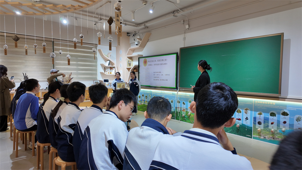 天台花园是学生探究生物成长奥秘平台,每个班级都在这里种下各自班级的植物,陪伴学生们一同成长。种子博物馆内,学生正分享自己用种子搭建的造景,这里是生物课的延伸课堂,更在学生心中播下热爱自然、保护环境的种子。