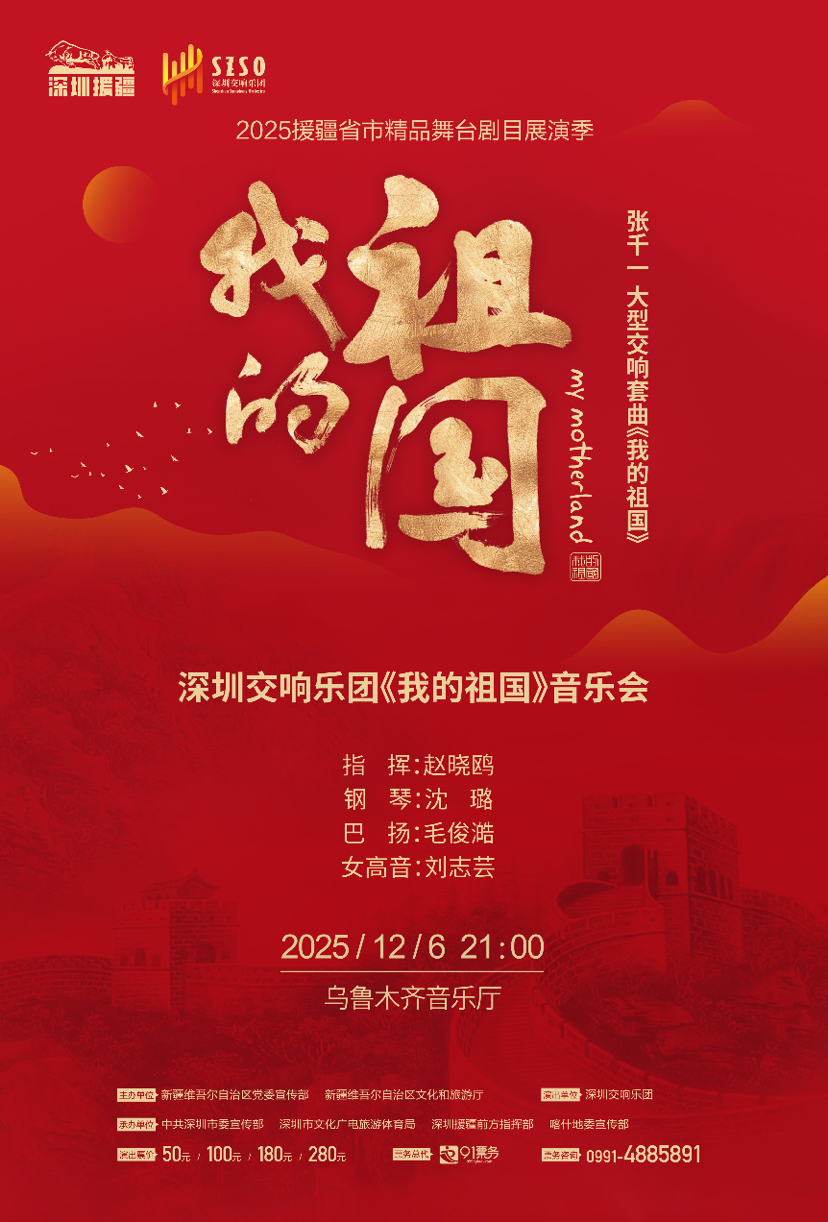 “文化润疆·‘深’情献礼”,新时代新征程,深圳交响乐团不忘初心,使命必达,践行艺术为民,以精品奉献人民,用动人旋律传递美好祝福,以艺术语言促进文化认同,为推动各民族文化的互鉴共融、铸牢中华民族共同体意识注入深圳力量。在新疆维吾尔自治区成立70周年的重要历史节点,这场跨越山海的音乐交流,将奏响民族团结与时代进步的华美乐章,抒写人民美好生活的幸福篇章。
