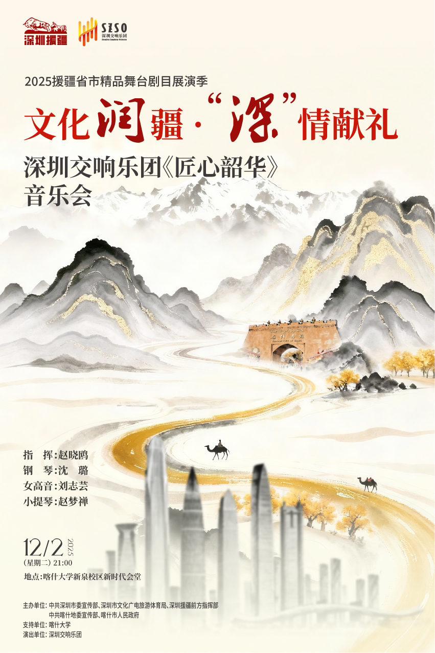 作为深圳文化援疆的重要组成部分,深圳交响乐团自2003年起持续赴喀什开展“文化润疆”演出,建立起以音乐促进交往、交流、交融的和美之桥。正值新疆维吾尔自治区成立70周年,乐团精心筹备《匠心韶华》与《我的祖国》两套主题音乐会,将分别于12月2日、3日在喀什大学,12月5日、6日在乌鲁木齐音乐厅上演。届时,深圳交响乐团携青年指挥家赵晓鸥、钢琴家沈璐、巴扬演奏家毛俊澔、女高音歌唱家刘志芸、小提琴家赵梦禅等杰出艺术家倾情演绎,以乐传情,为喀什和乌鲁木齐的观众奉上精美的音乐盛宴,以文艺铸牢民族团结之魂。