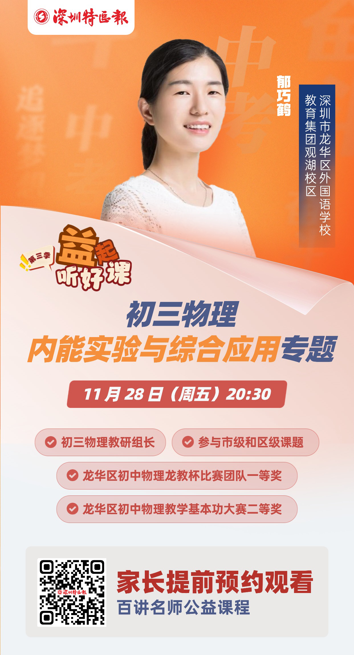 本期“深圳名师公益课堂”邀请来深圳市龙华区外国语学校教育集团物理教师郁巧鹤老师讲解内能实验与综合应用的话题。