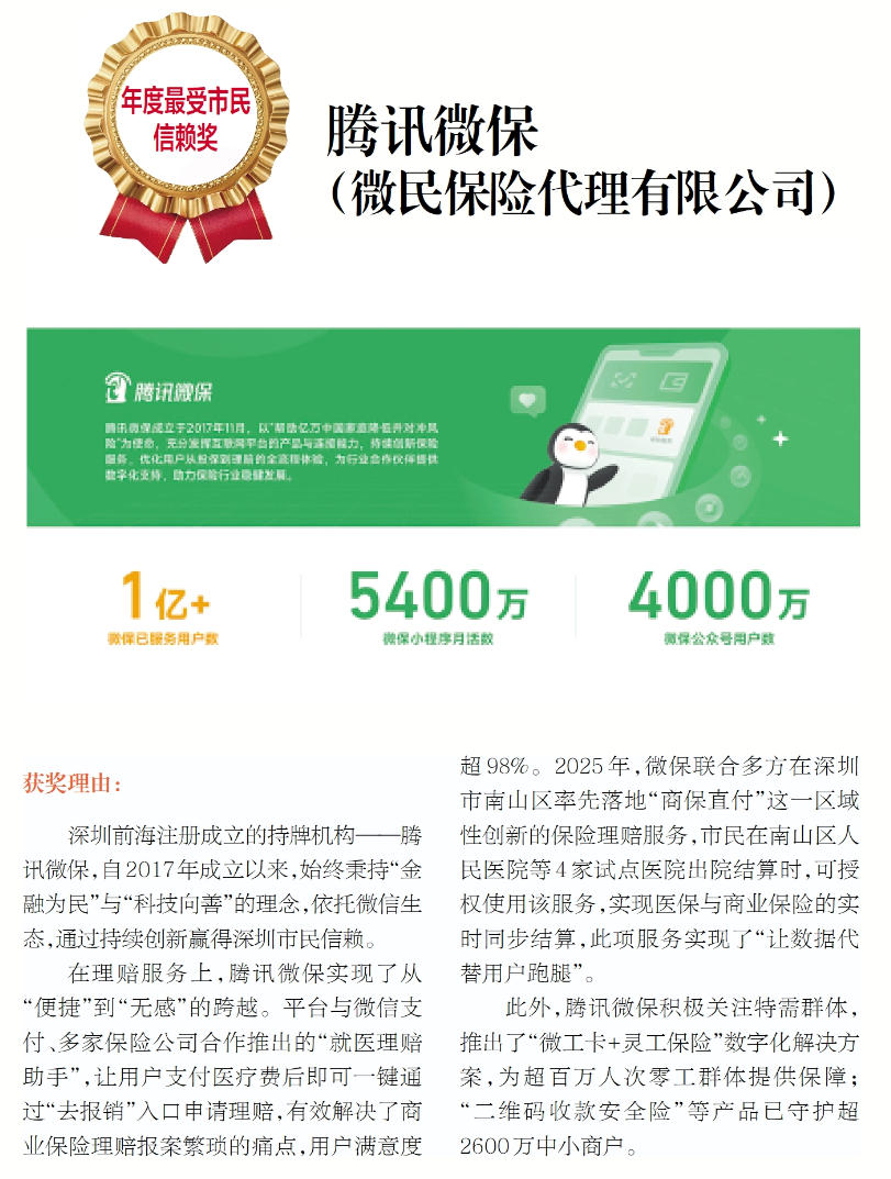 深圳前海注册成立的持牌机构——腾讯微保,自2017年成立以来,始终秉持“金融为民”与“科技向善”的理念,依托微信生态,通过持续创新赢得深圳市民信赖。