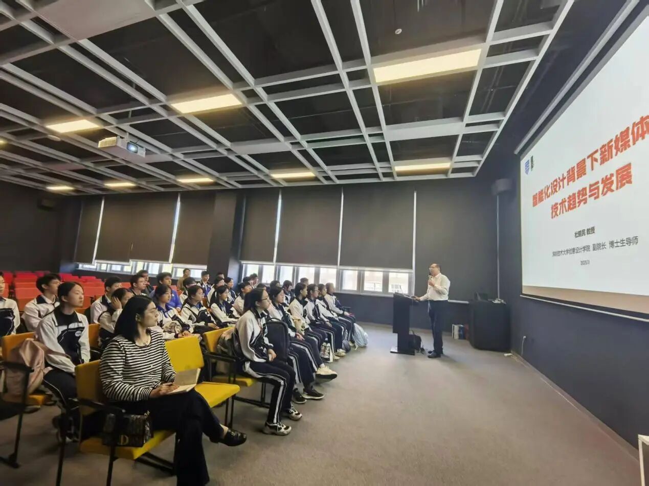 活动中,深圳技术大学创意设计学院副院长杜鹤民以“智能化设计背以景下新媒体艺术技术趋势与发展”为题,为学生们做讲座。杜鹤民教授系统介绍了新媒体艺术专业的课程设置与教学重点,通过展示学生课程作业和教学内容,生动呈现了专业学习的广度与深度。他还分享了行业技术的最新发展趋势,为同学们描绘了清晰的职业发展路径。