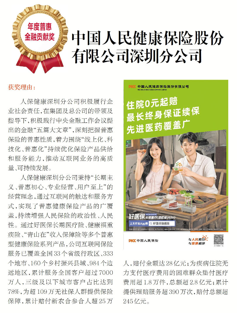 人保健康深圳分公司秉持“长期主义、普惠初心、专业经营、用户至上”的经营理念,通过互联网的触达和服务方式,实现了普惠健康保险产品的广覆盖,持续增强人民保险的政治性、人民性。通过好医保长期医疗险、健康福重疾险、“青山在”收入保障险等多个普惠型健康保险系列产品,公司互联网保险服务已覆盖全国33个省级行政区、333个地市、160个乡村振兴县域、984个边远地区,累计服务全国客户超过7000万人,三级及以下城市客户占比达到78%,为超109万无社保人群提供保险保障,累计赔付新农合参合人超25万人,赔付金额达28亿元;为疾病住院无力支付医疗费用的困难群众垫付医疗费用超1.8万件,总额超2.8亿元;累计提供理赔服务超390万次,赔付总额超245亿元。