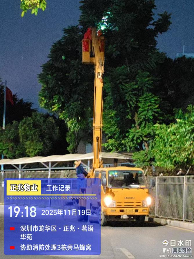 行动当日,专业人员在高空作业车上,使用专业手法迅速将蜂窝摘除,并对残留部位进行彻底清理,彻底排除了隐患。