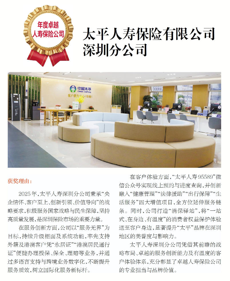 2025年,太平人寿深圳分公司秉承“央企情怀、客户至上、创新引领、价值导向”的战略要求,积极服务国家战略与民生保障,坚持高质量发展,是深圳保险市场的重要力量。