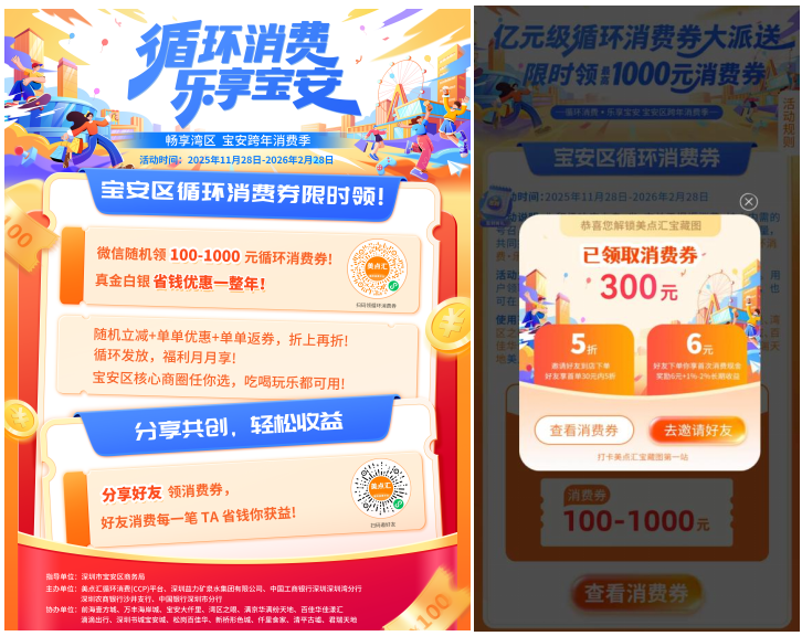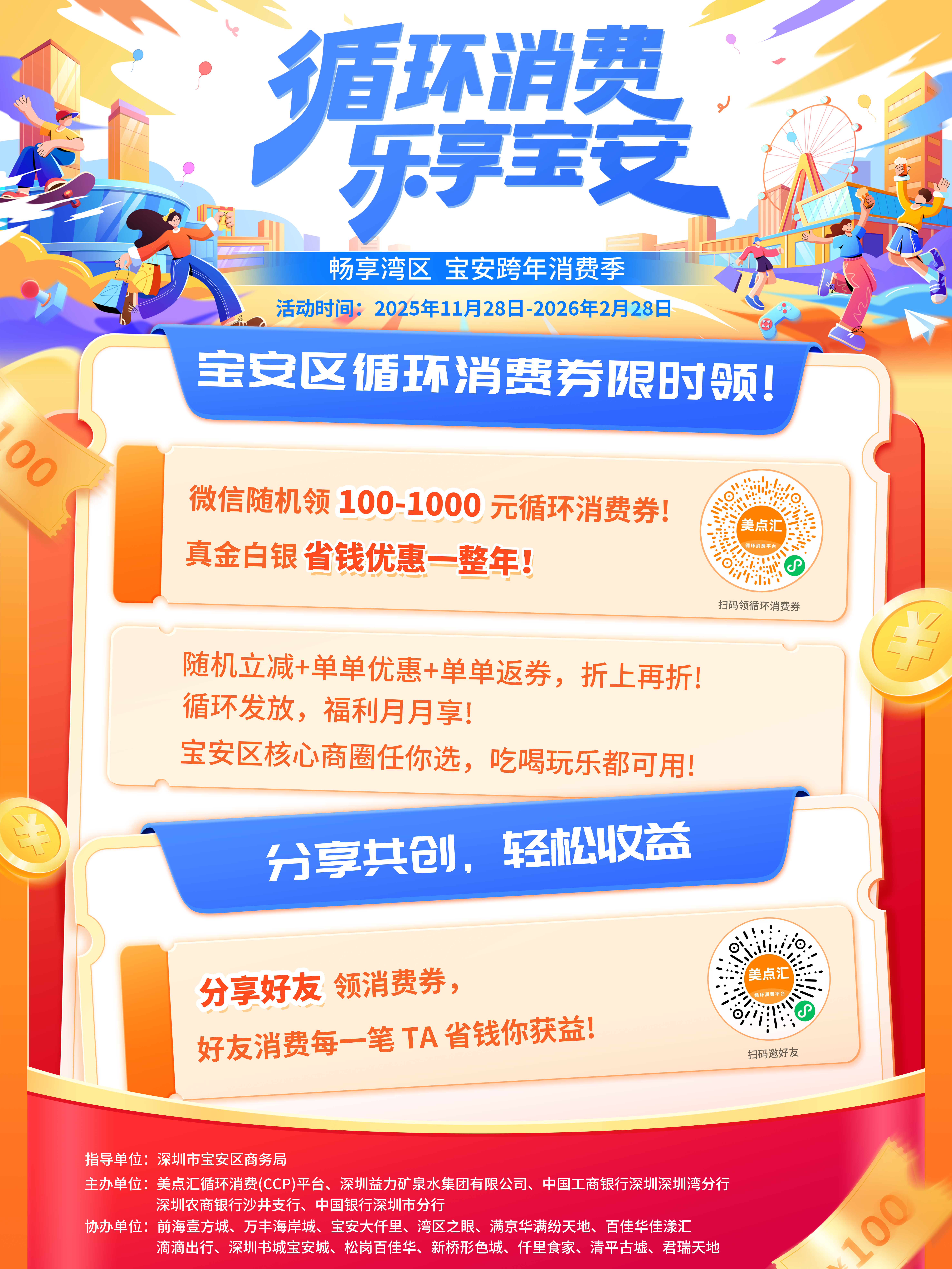 11月28日上午,循环消费·乐享宝安“宝安跨年消费季循环消费”活动启动仪式在前海壹方城音乐广场举行。本次活动由宝安区商务局指导,携手美点汇循环消费平台,通过“政府搭台、商业唱戏、民生受益”的模式,推出亿元级专享循环消费券,助力市民享实惠、商户增活力、区域促发展。