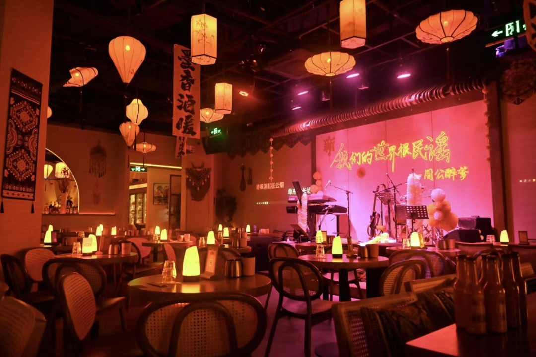 周公醉梦・民谣餐酒馆则带来美食与民谣的双重治愈。上半场大口享用川湘风味美食,满足味蕾的狂欢;下半场伴着民谣弹唱微醺尽兴,热烈的年轻摇滚气息越听越上头,醇厚回甘的特调酒品更让人沉浸其中。