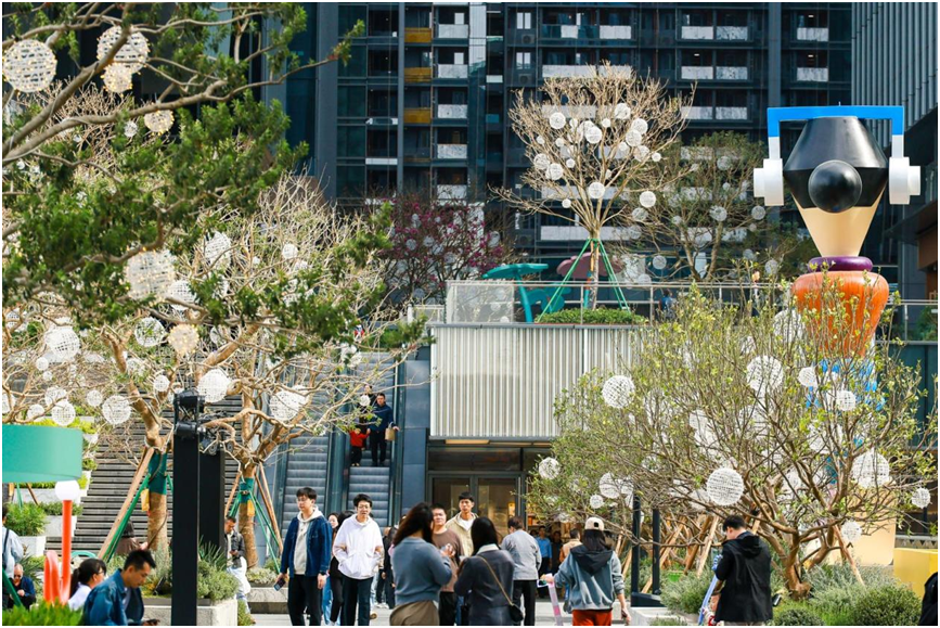公共艺术计划更是激活屋顶空间。超5000平方米的屋顶花园,推出“附近游玩家”公共艺术计划。该计划不仅呈现了《纽约时报》TOP100插画师Jeremyville的作品《The Music Lover and Her Companion》全球首展,还联合艺术家殷晖与社区居民发起共创编织计划,结合“附近的小径”等艺术装置,将屋顶花园构建为一个可游可玩、促进邻里交流的“口袋公园”。